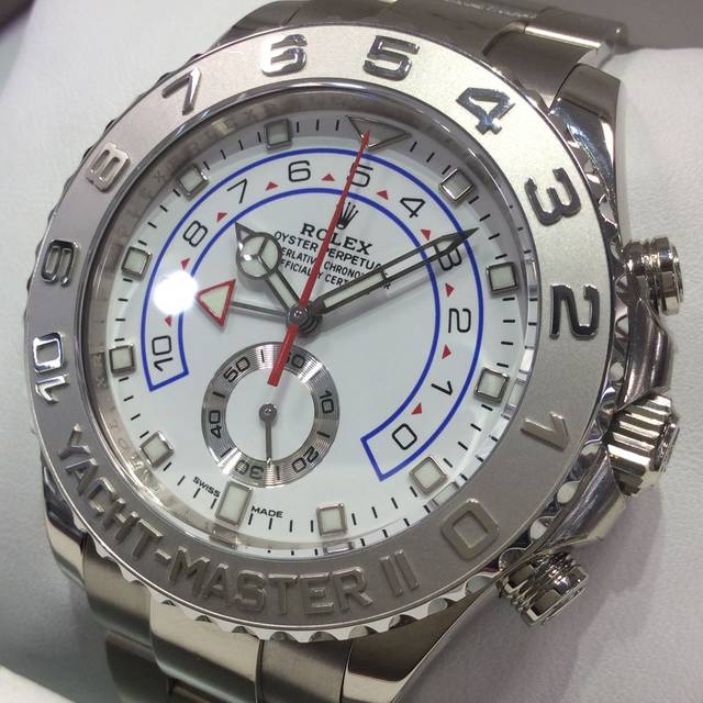 こちらはロレックス ヨットマスター2 116689 ホワイトゴールド無垢×プラチナベゼルです。