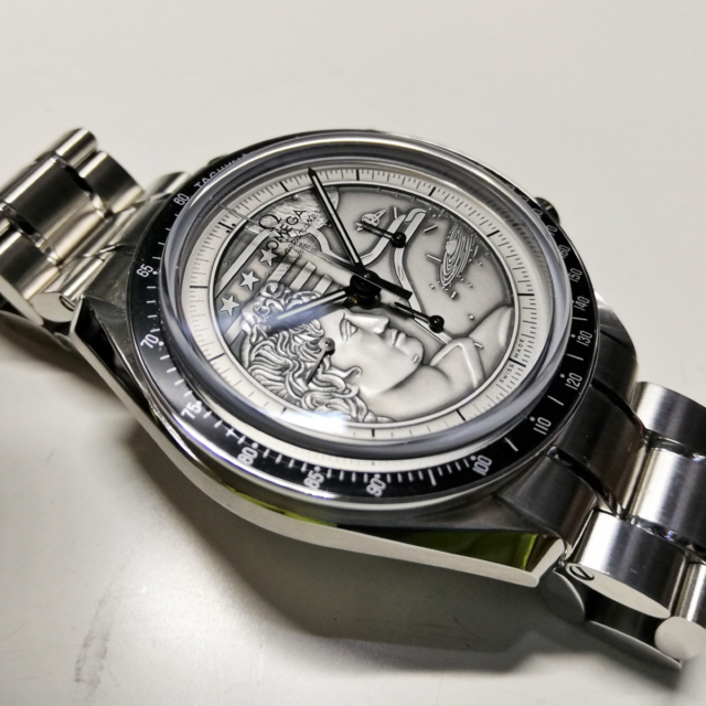 ユージン・サーナン宇宙飛行士の偉業を顕彰したモデルで、文字盤は925シルバー製のアポロ17号パッチが刻印されています。今までにない特別な"ムーンウォッチ"といえますね。