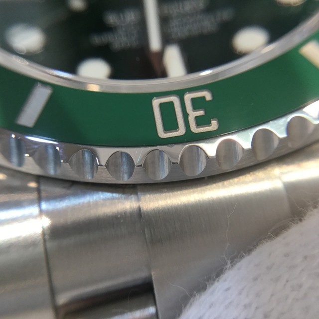 高級感と耐久性が与えられたグリーンのセラミック製回転ベゼルには目盛りの部分にプラチナをコーティングしています!