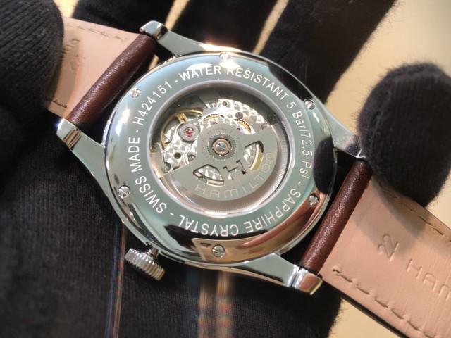 そして、トランスパレント化された裏蓋から見えるのは80時間のパワーリザーブを誇るキャリバーH-10。ETA2824-2を改良したことで、リザーブを伸ばしました。この価格帯でこれほど安定したムーブメントはなかなかありません!