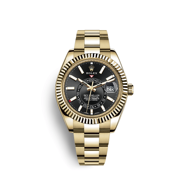 18 ct イエローゴールドのオイスター パーペチュアル スカイドゥエラーは、ブライトブラック(シャンパン / ホワイト)ダイアルとオイスターストラップを備えた時計で、ダイアル上のオフセンターに配置したディスクで第2タイムゾーンを表示する。