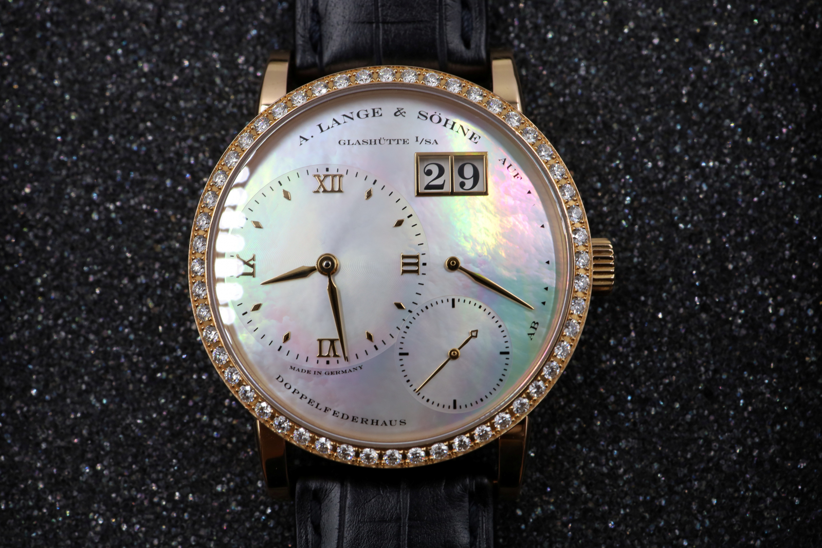 →YouTube実機動画:実機動画 ランゲ&ゾーネ リトルランゲ1 ソワレ(クライネ) Ref.813.047 ダイヤベゼル シェル文字盤