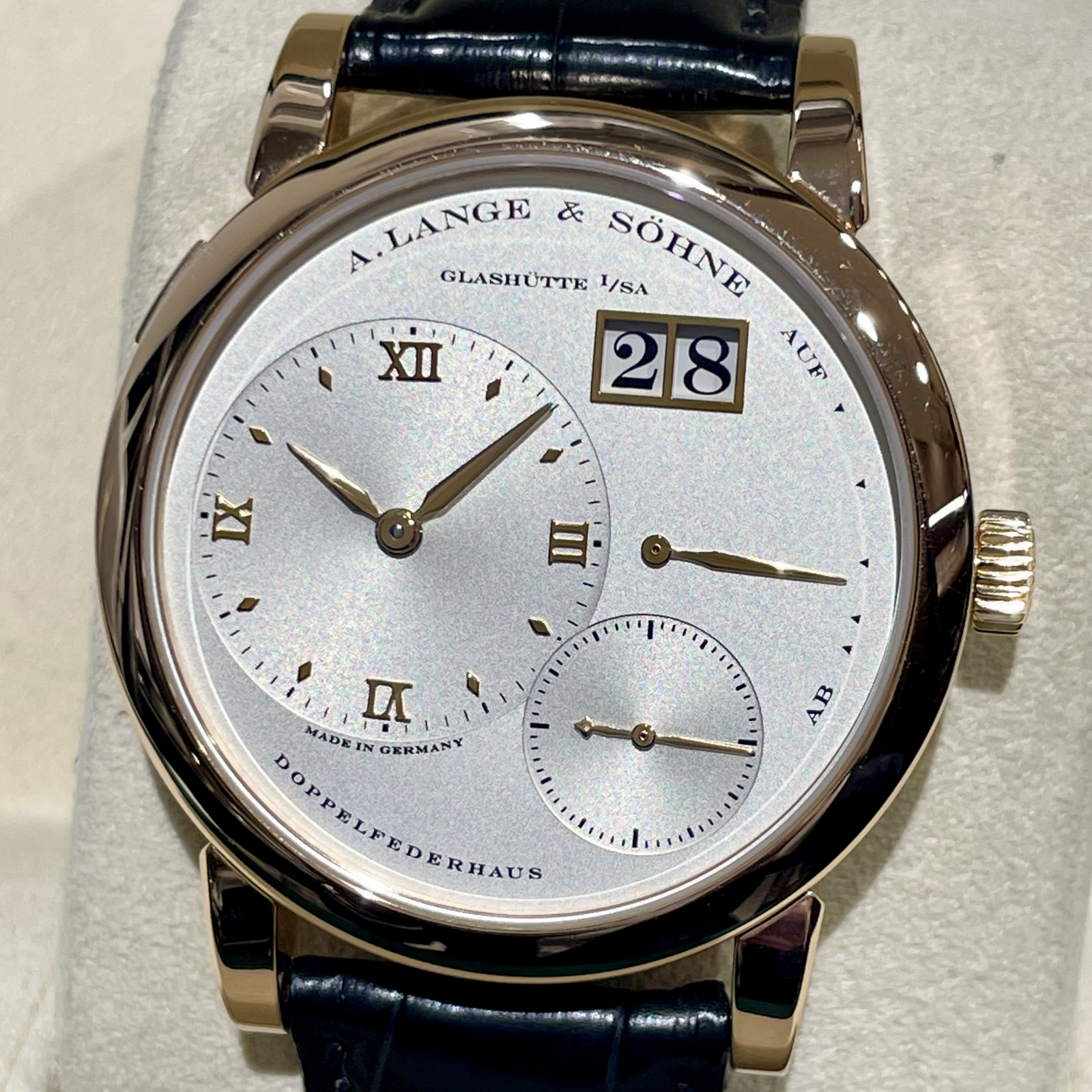 時刻、スモールセコンド、パワーリザーブの各機能が、重ならないようにバランスよく配置されておりランゲらしいお品物です。
