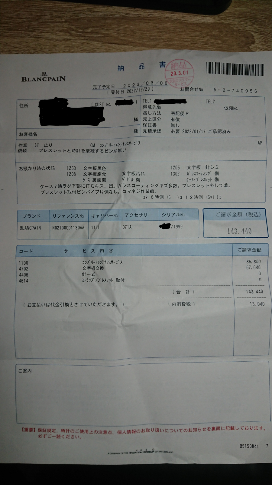 オーバーホール納品書は個人情報があるため画像のみで、付属しません。