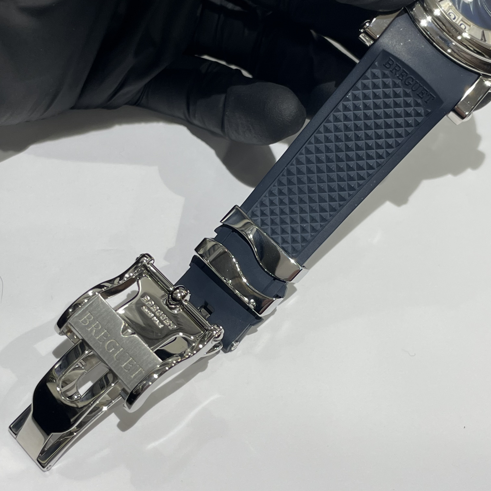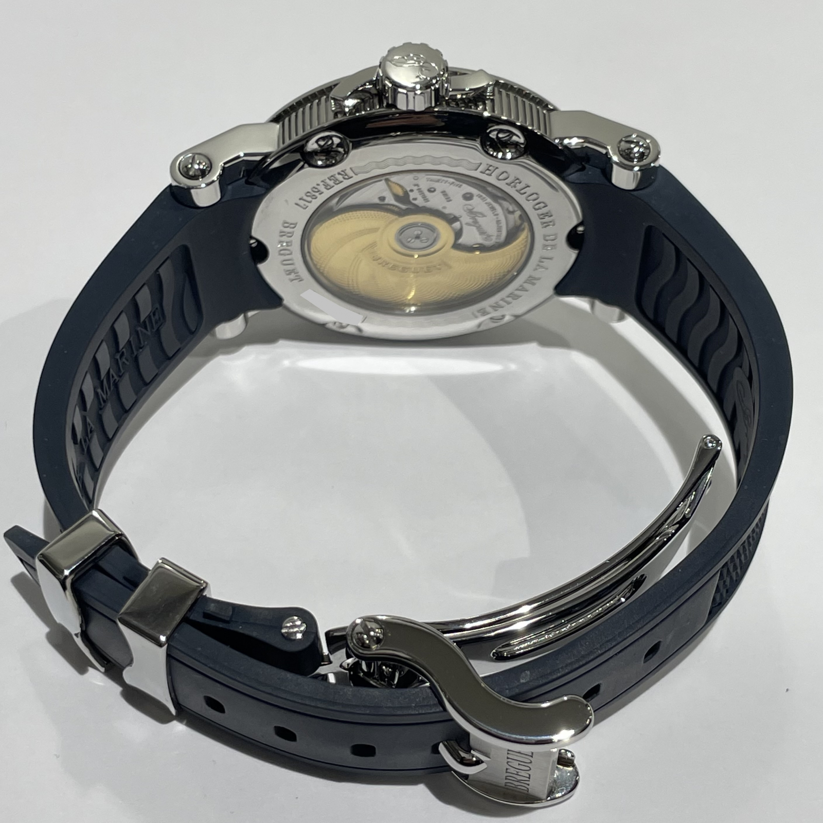 6時位置に視認性抜群のビッグデイトがデザインされ、ブレゲといえばのコインエッジのケースサイド、ケースバックはサファイアクリスタルを使い、ムーブメントがご鑑賞いただけます。