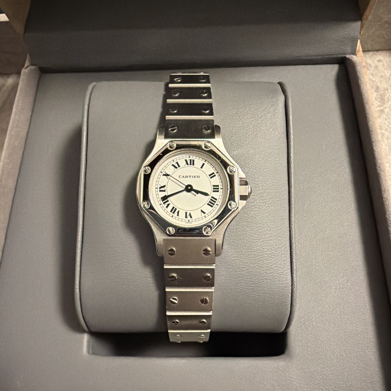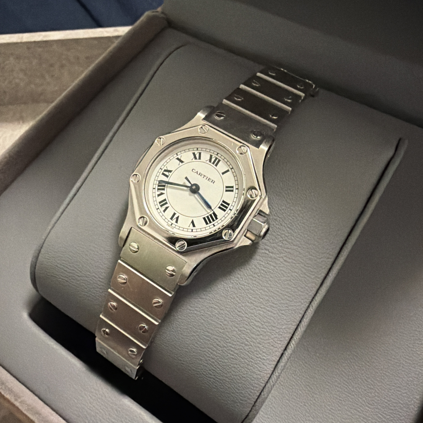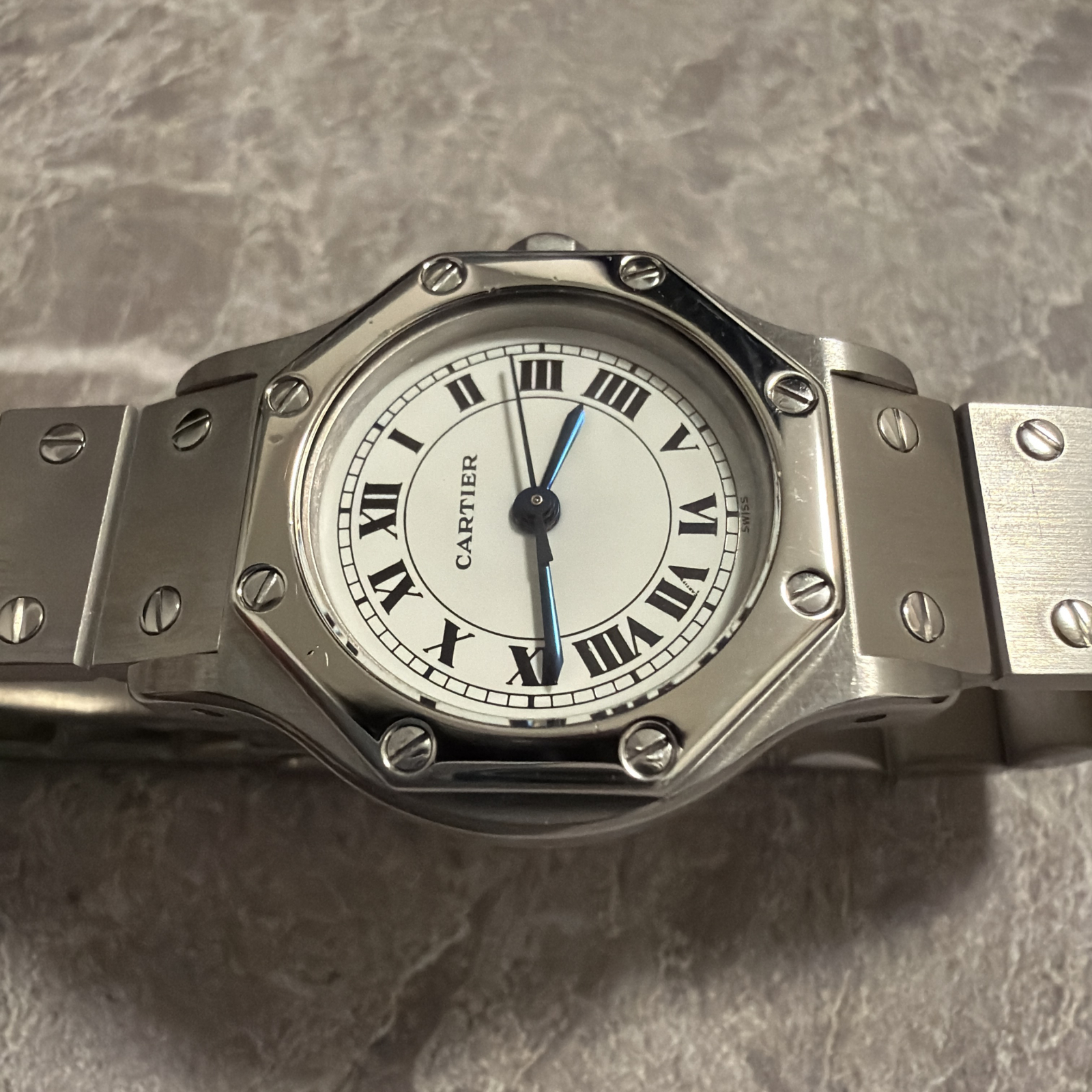 カルティエのヴィンテージモデル「サントス オクタゴン SM」です。2025年12月に整備(OH)と外装仕上げを行っております。