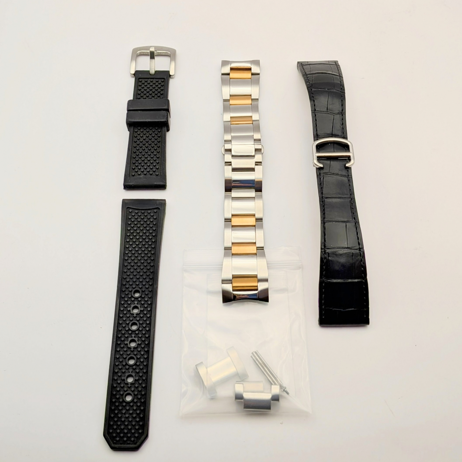 ラバーベルトとステンレスベルトはカリブルドゥカルティエの互換品でデザインはかなり似ています。