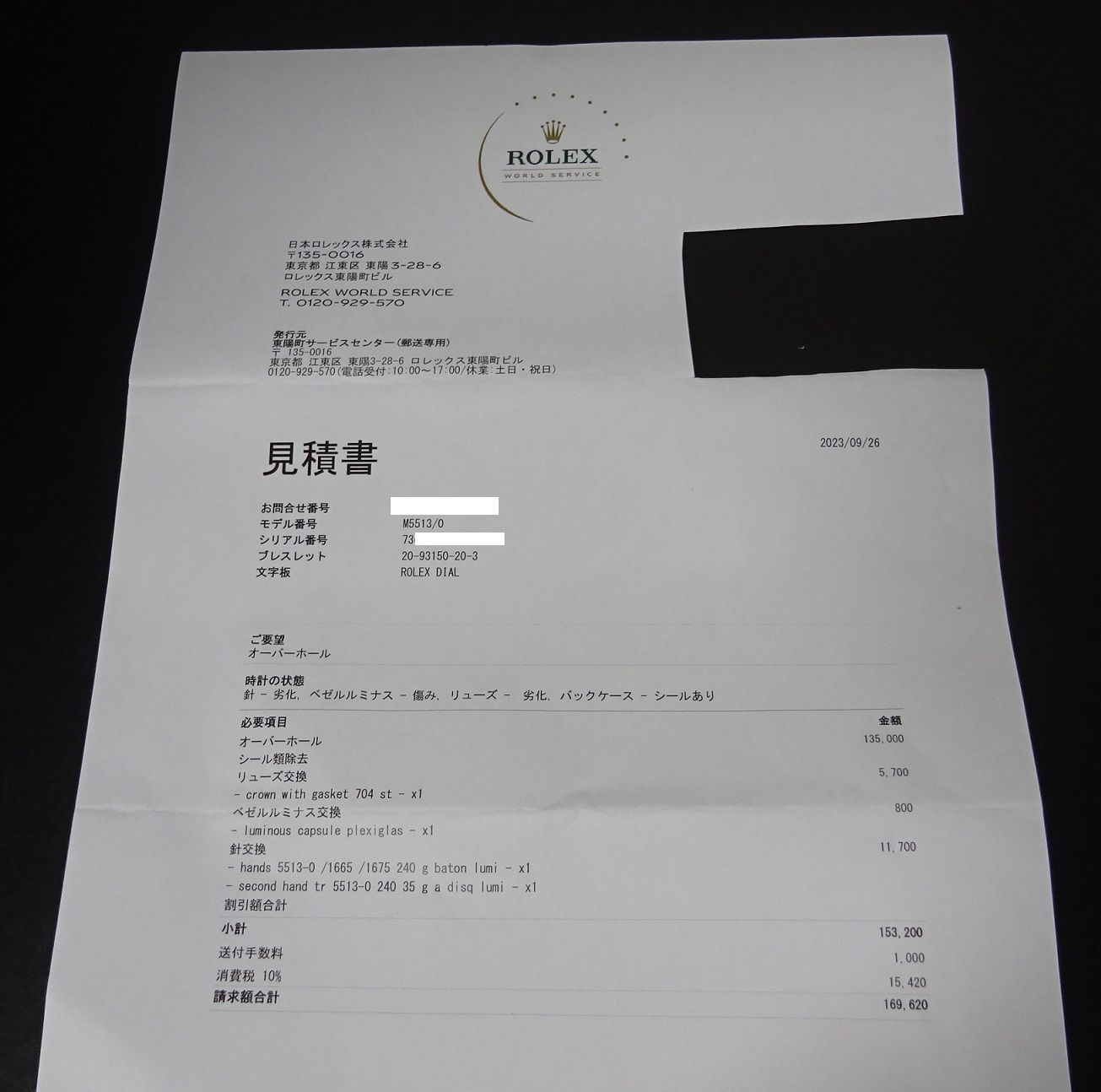 2023年9月 日本ロレックスにてオーバーホール見積取得 *未実施