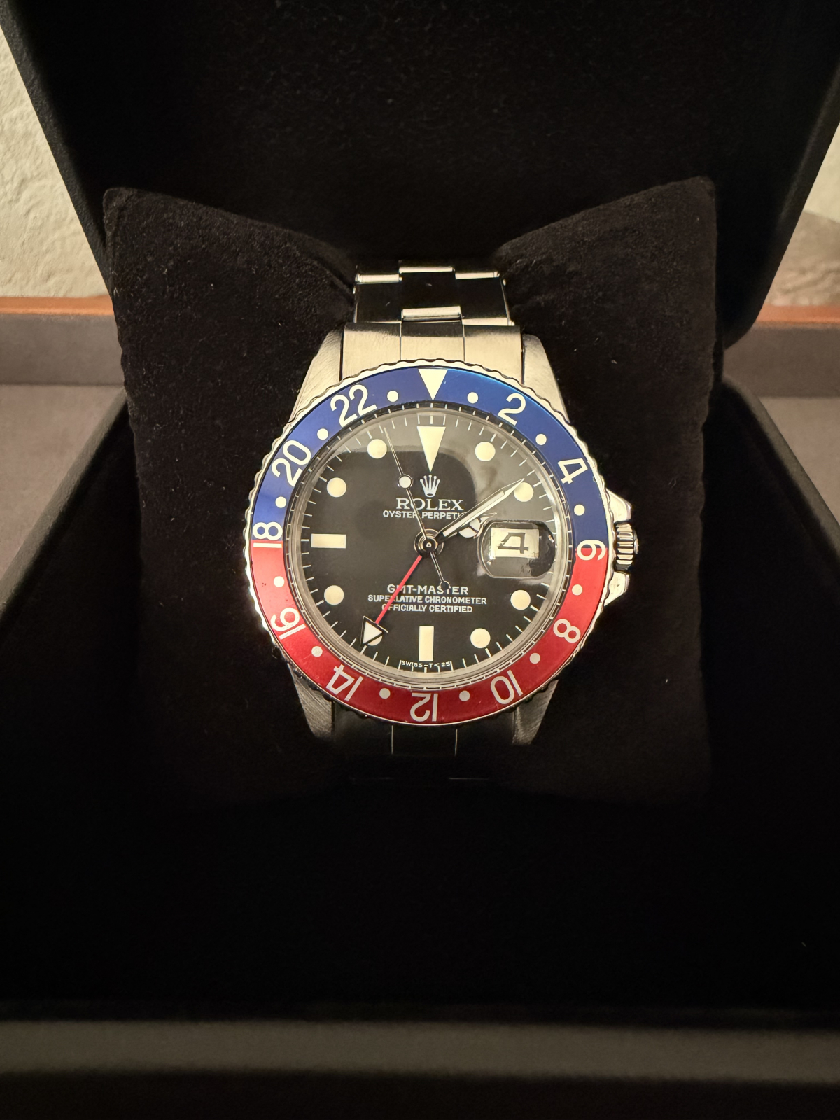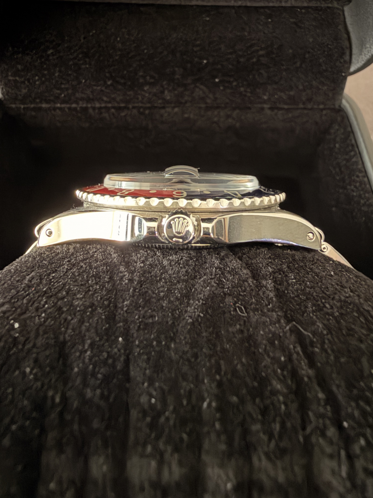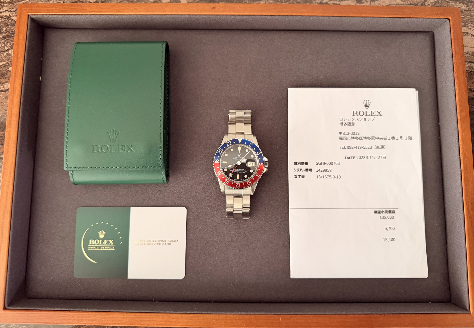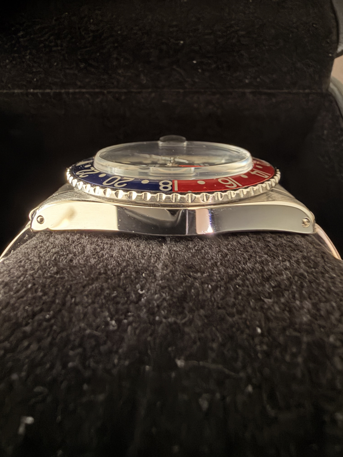 初代ペプシのご紹介です。文字盤とブレスレットは過去に交換用の正規品に交換されています。また2023年に日本ロレックスによって実施されたOHでは竜頭と針が新しいものと交換されたようです。