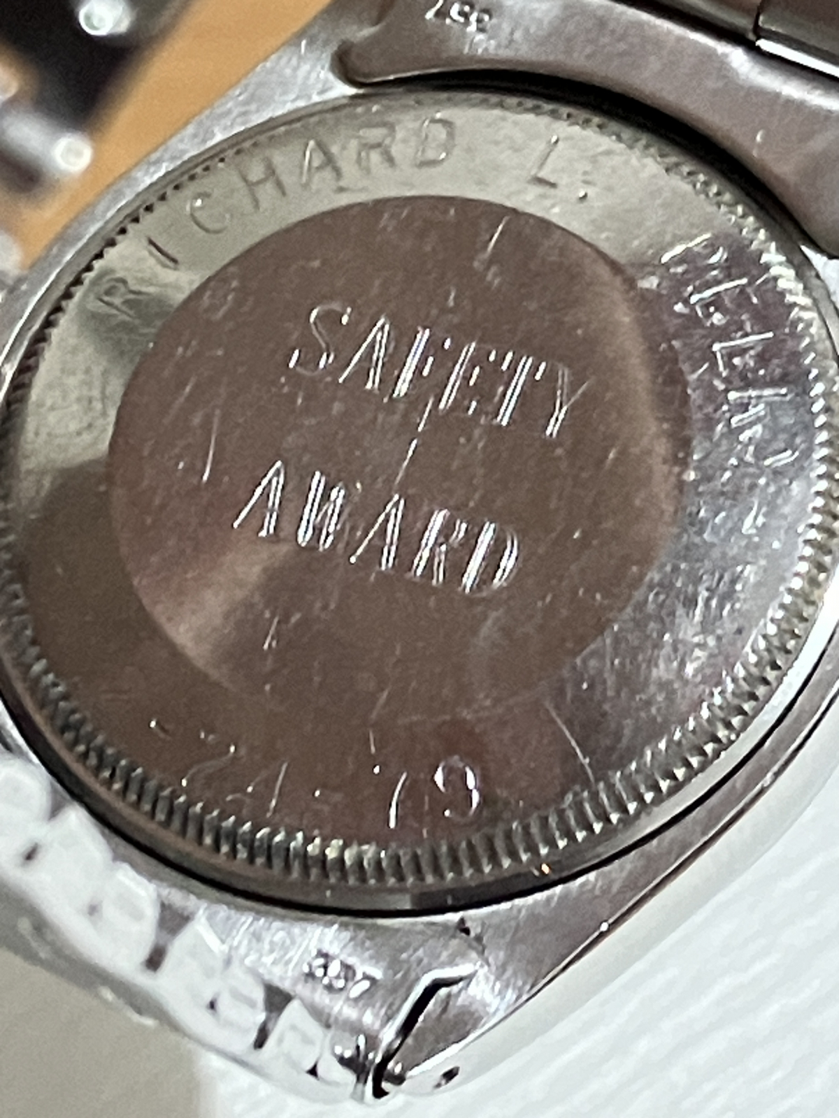 「裏蓋に表彰されファーストオーナーと思われるネーム、月日が刻印されています」