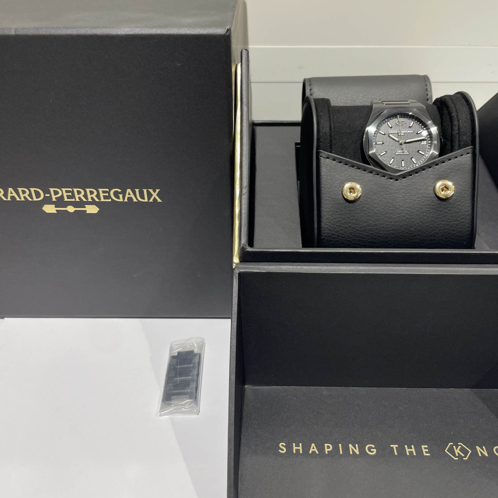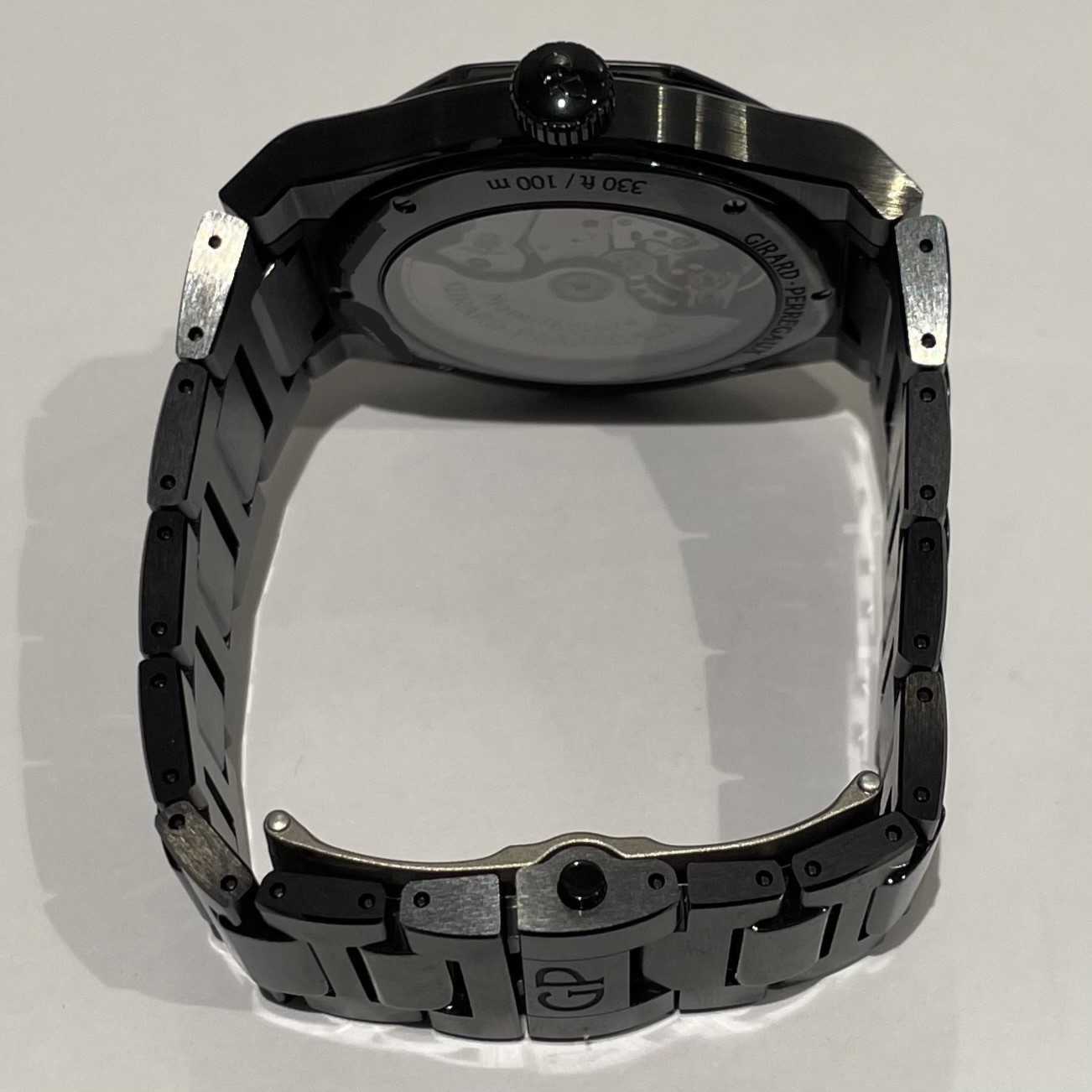 ブラックダイアルには一つ一つ小さなピラミッド型を成す「クル・ド・パリ」装飾が施されていて、シースルーバックからは54時間パワーリザーブの自社製自動巻きキャリバー「GP01800」がご鑑賞いただけます。