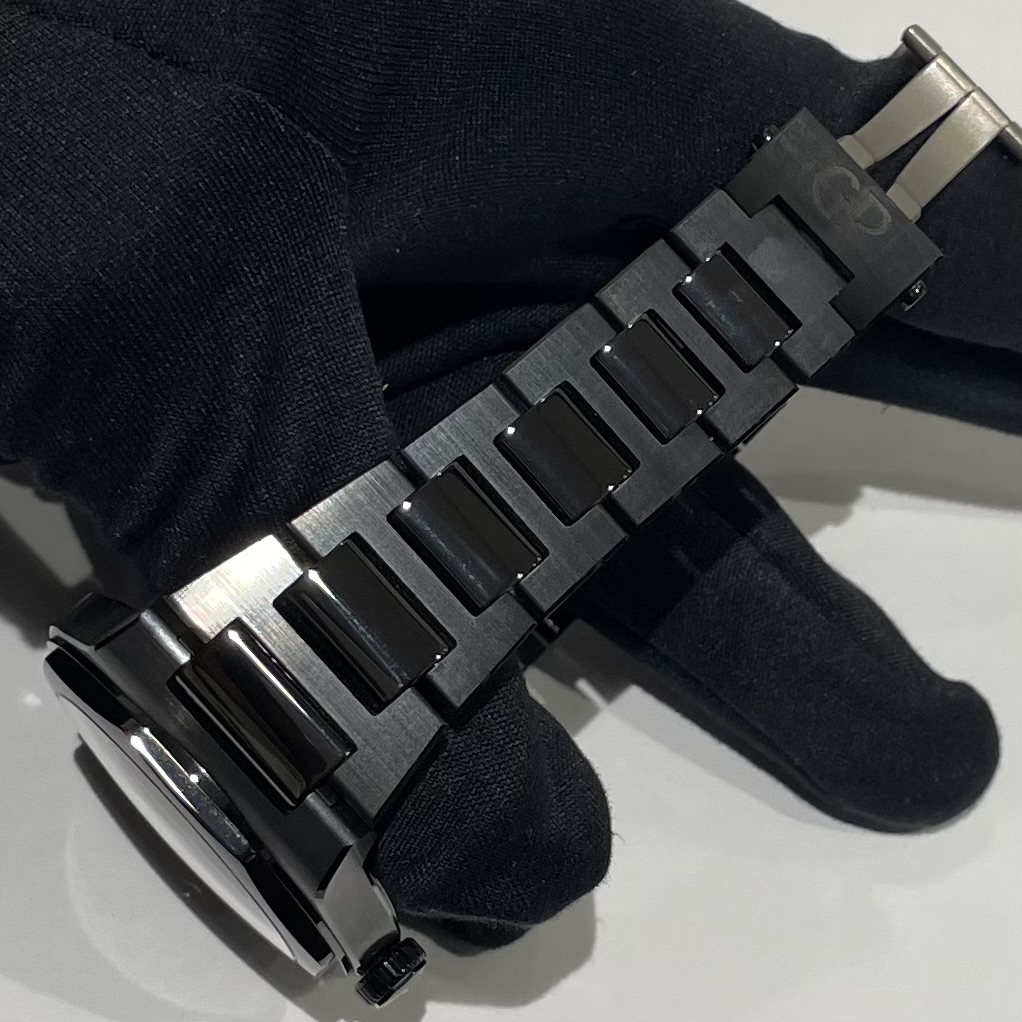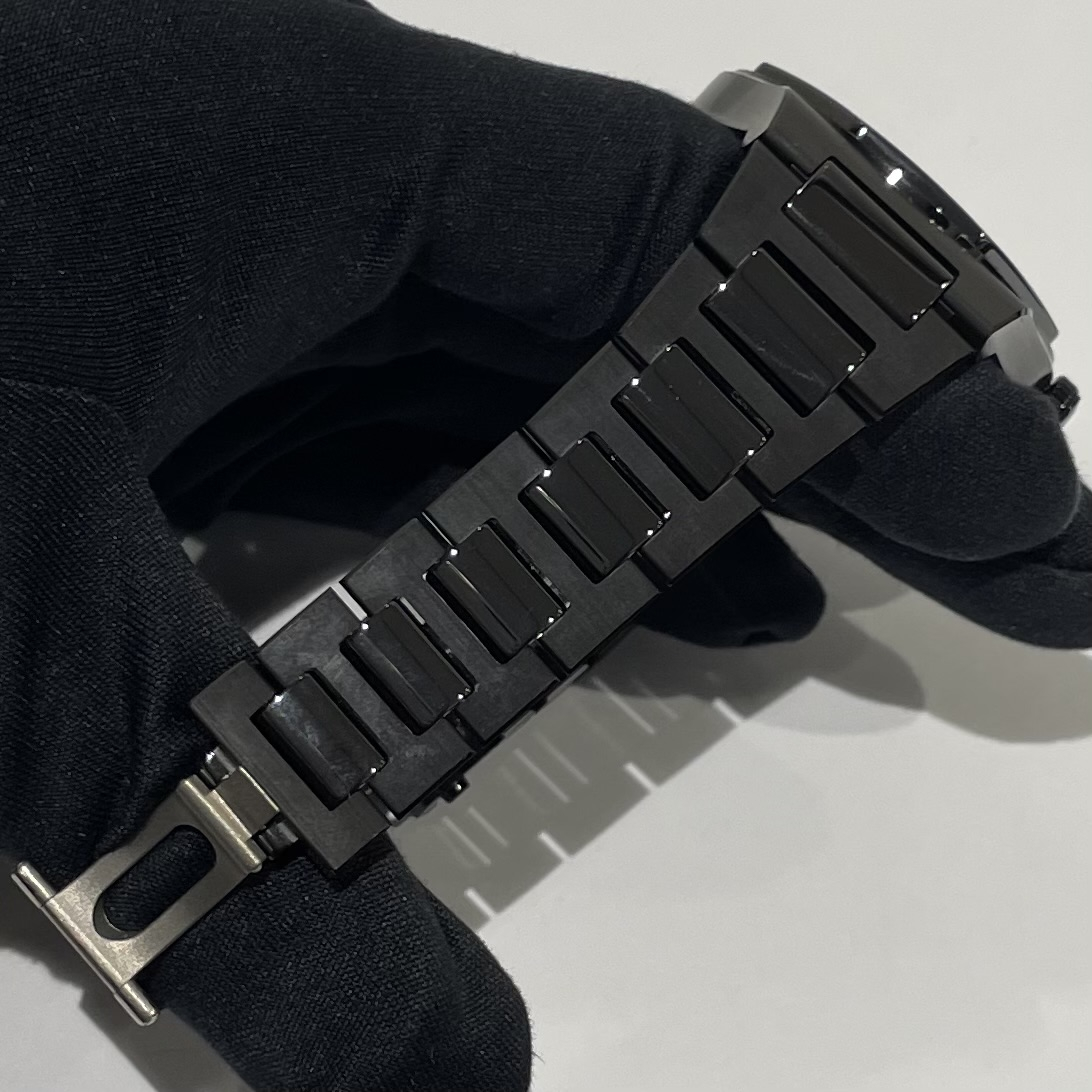 ケースから流れるように一体化したブレスレット形状が特徴的なお品物です。着用感も抜群でございます。