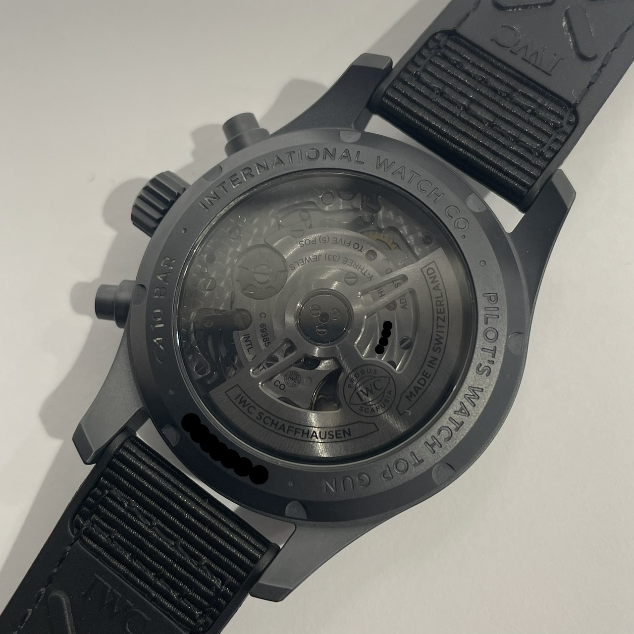 IWCが開発したチタンとセラミックの合金「セラタニウム」製ケースを採用しており、軽量かつ高硬度で、摩耗に強くキズの付きにくいお品物です。