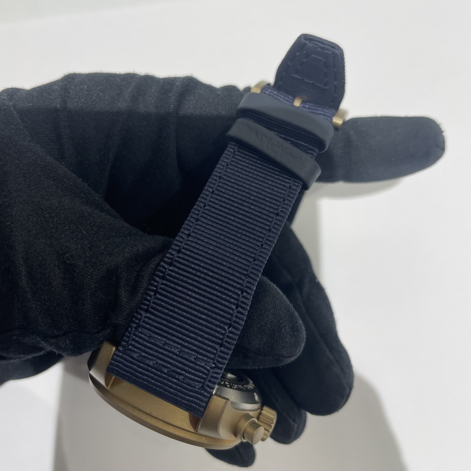風防には両面反射防止加工がされていたサファイヤガラスが採用され、ブルー文字盤とブロンズの