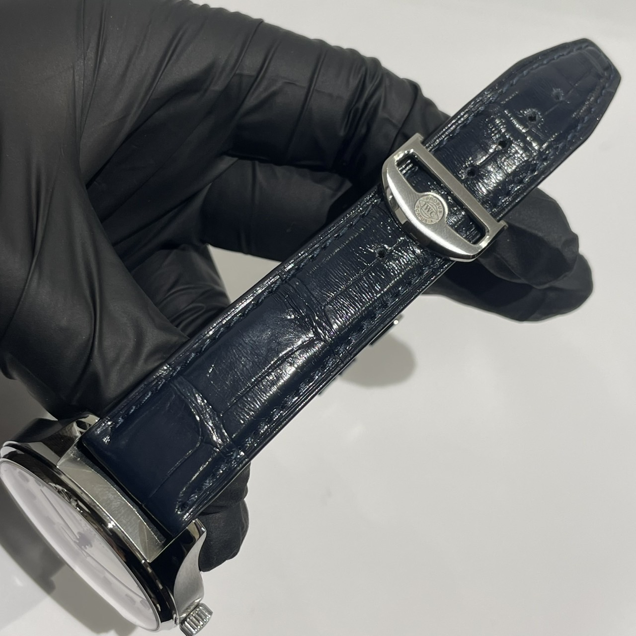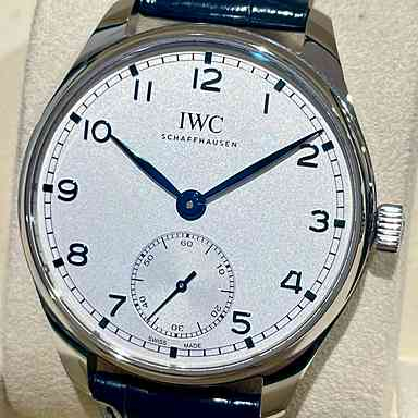 6時位置にスモールセコンドを配したクラシカルなデザインで、青焼きされたリーフ針とアラビア数字の組み合わせがIWCらしいデザインです。
