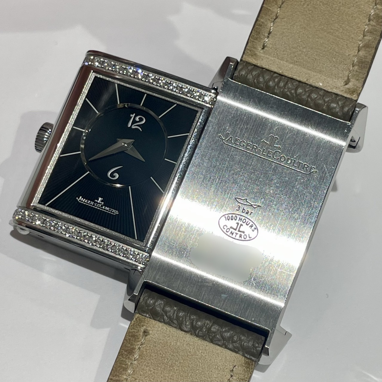 文字盤も表側はクラシックなシルバーダイアル、裏側にはブラックダイアルに上下にダイヤモンドをセッティング、華やかかつシンプルにも変更可能で実用性の高いお品物です。