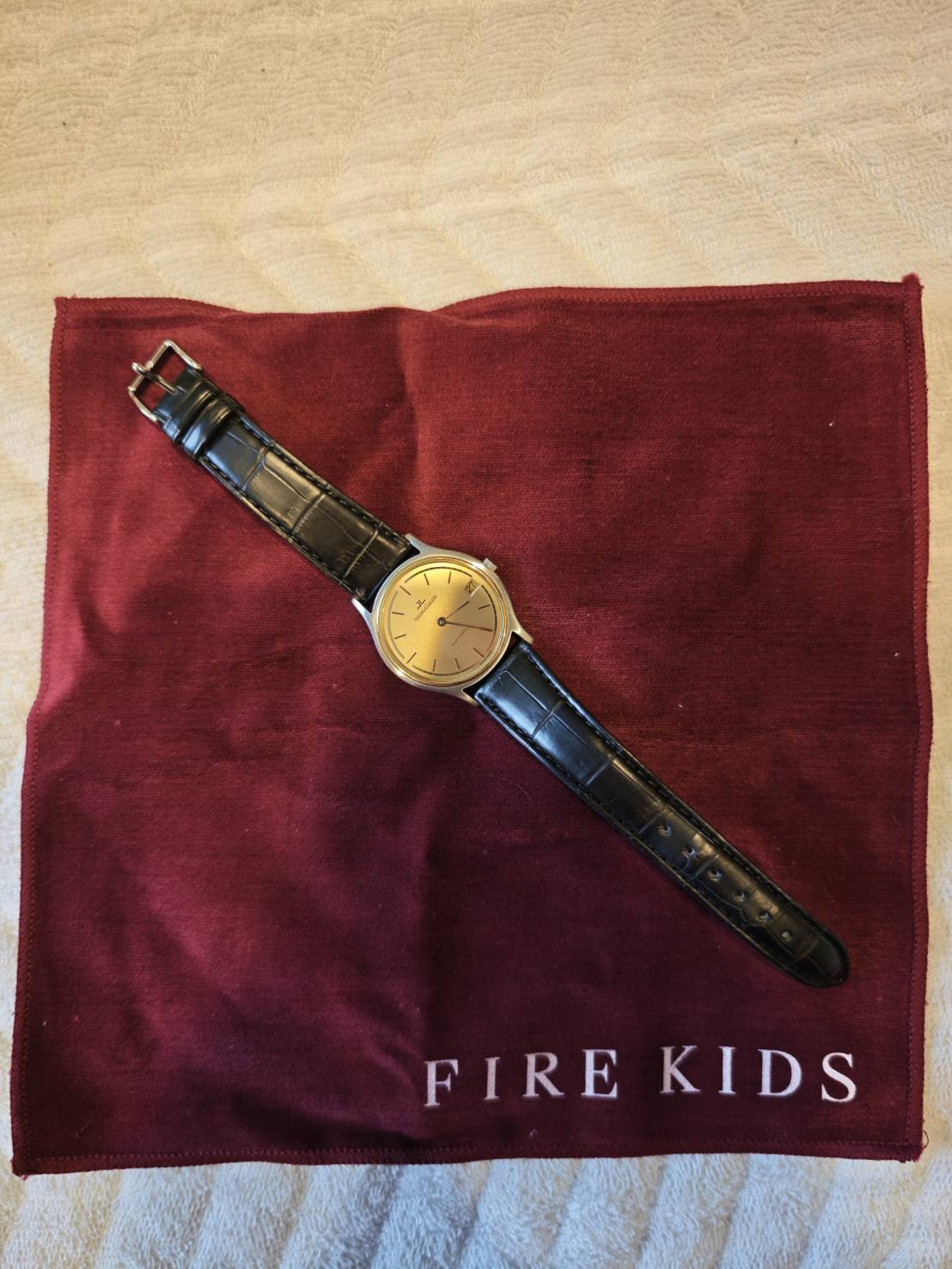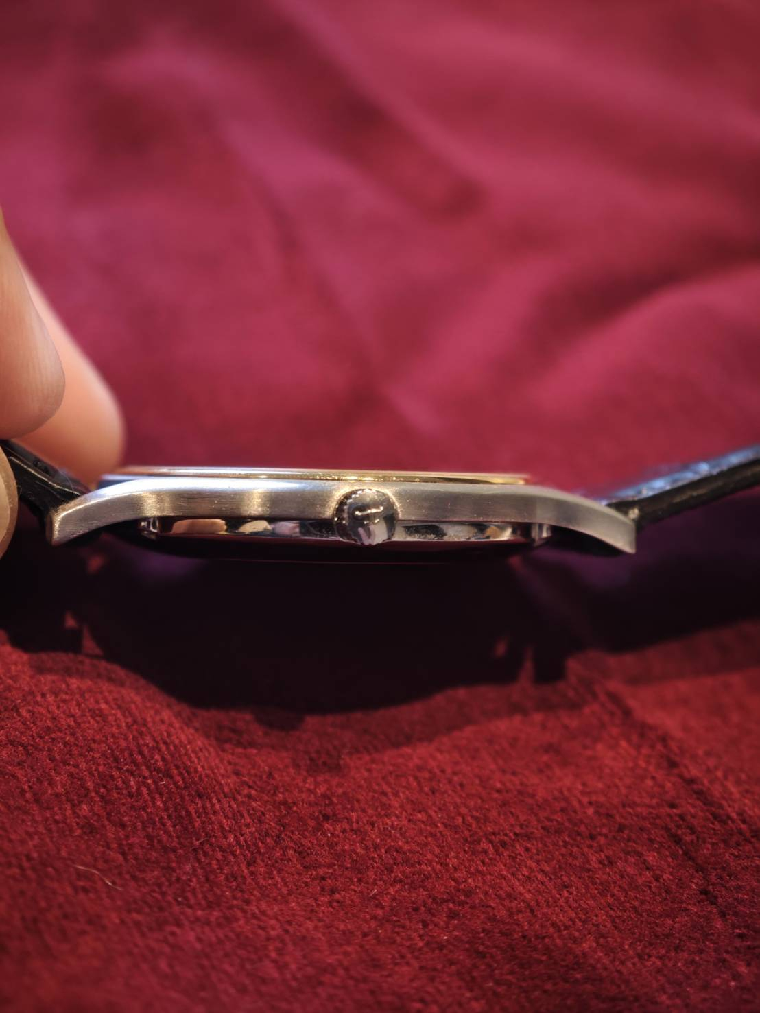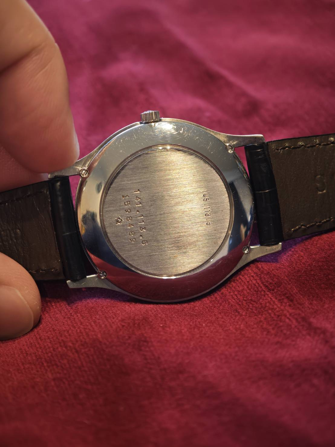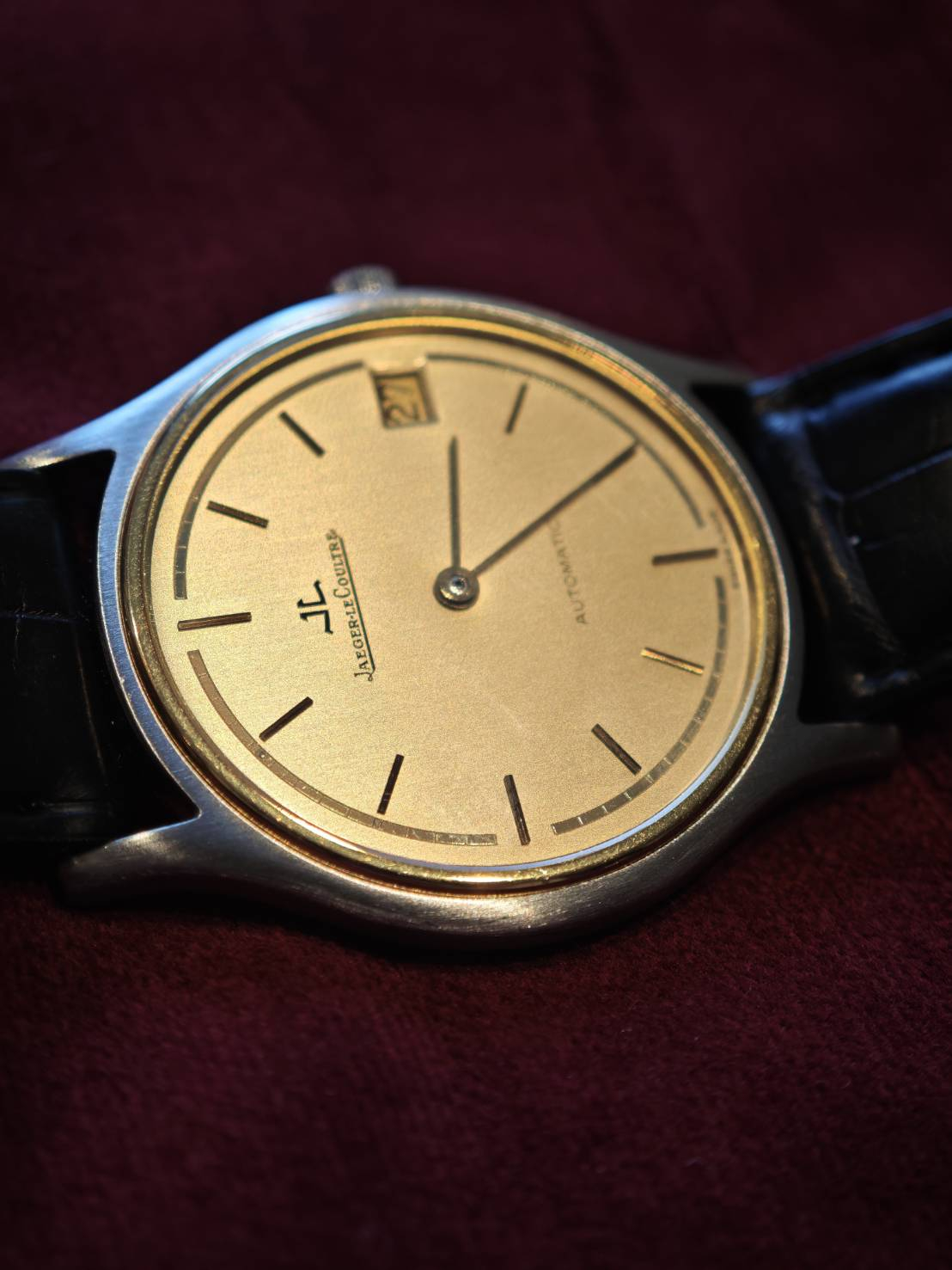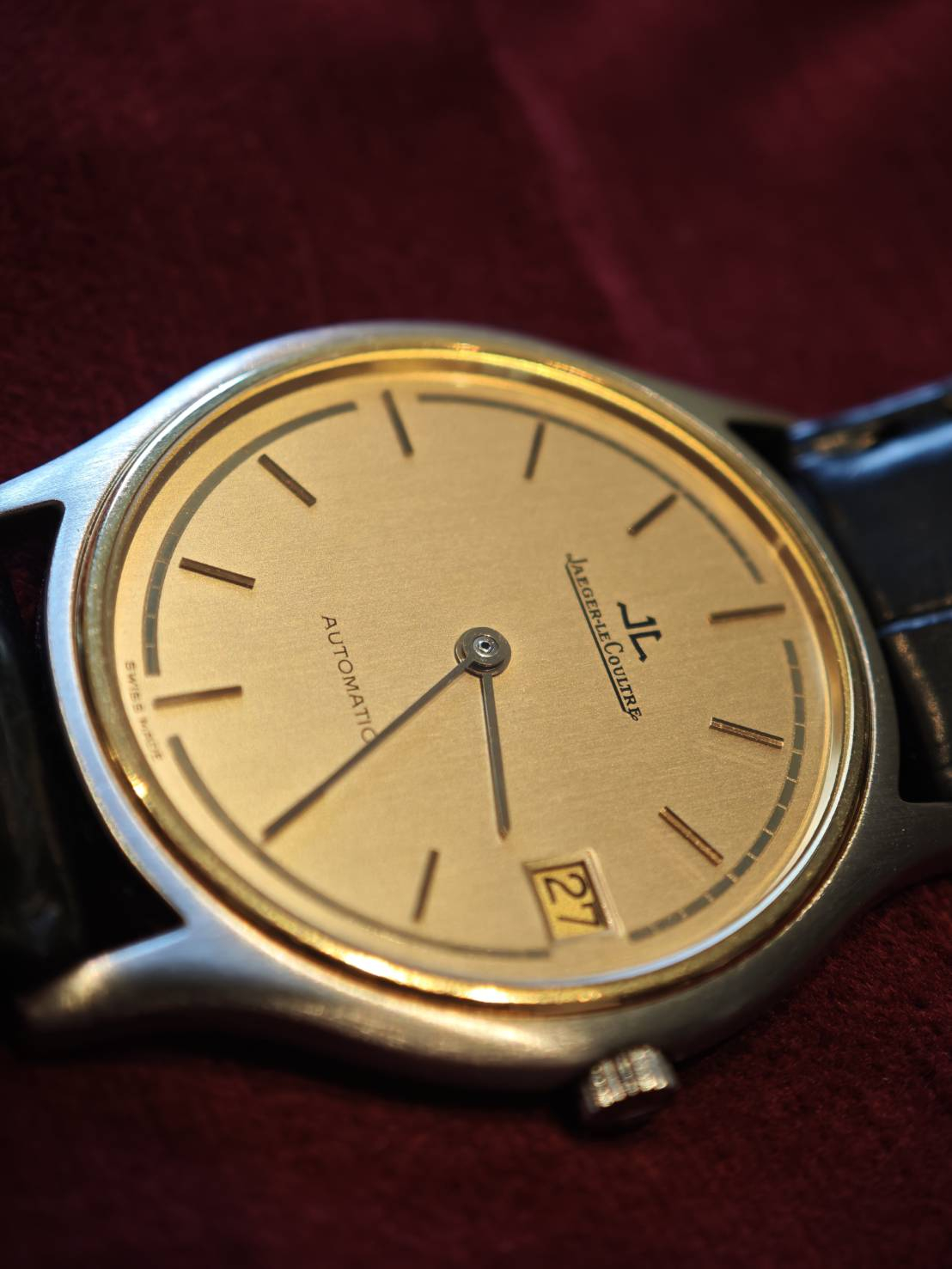 1980年代のJAEGER-LECOULTRE ラウンドケースです。薄型のケースにイエローゴールドベゼル、シャンパンダイヤルに、2針の古典的な雰囲気のドレスウォッチです。ムーブメントは自動巻きのCal.888を搭載。都内の某有名アンティーク腕時計店で購入し、オーバーホール済です。ベルトはクロコダイルレザーベルトを合わせています。リファレンスナンバーは裏面にRef.145.113.5とRef.141.113.5の両方の記載があります。オーバーホール済ですがアンティーク時計ということをご理解の上ご購入ください。