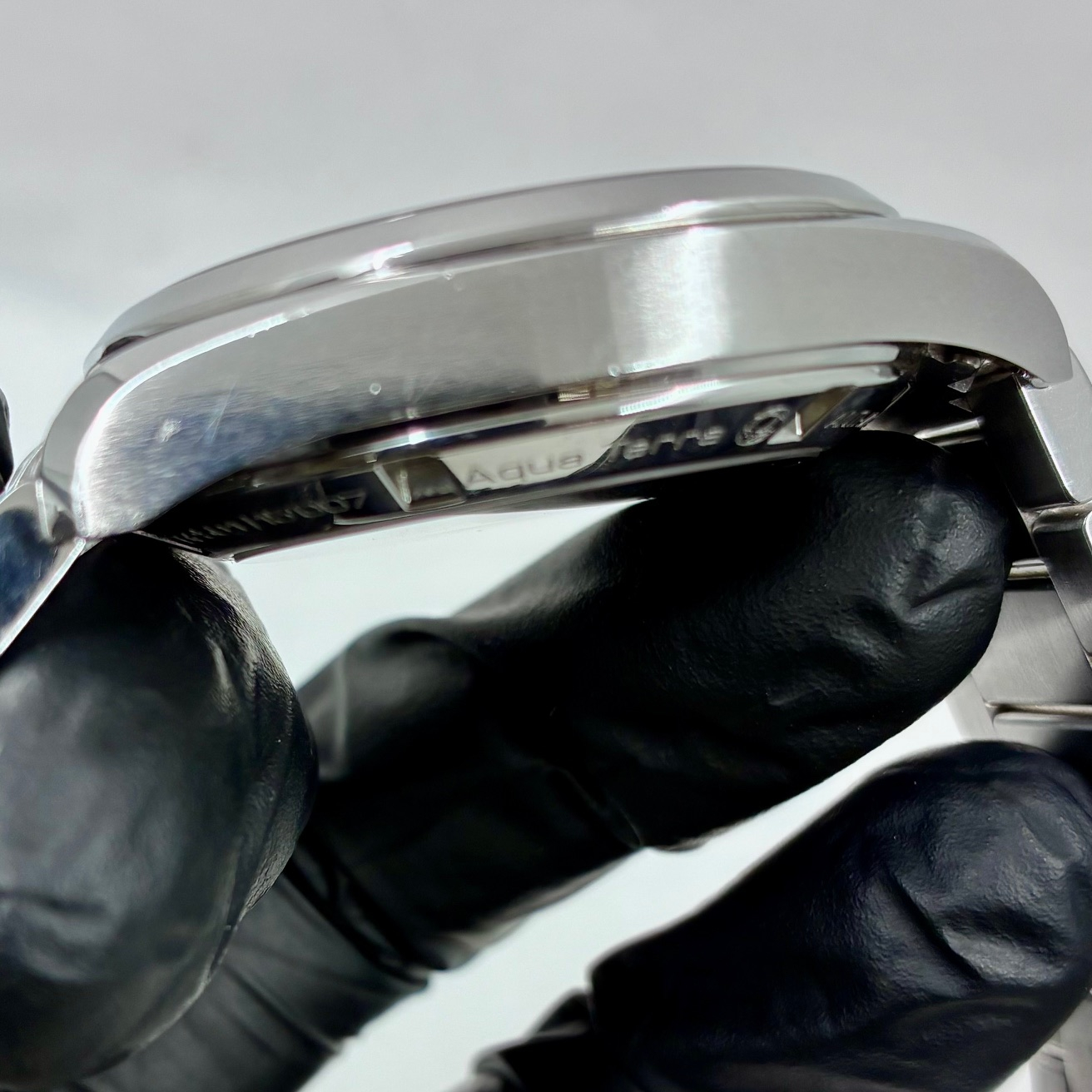 15007本限定の2015年モデル アクアテラ007 ジェームスボンドです。交換用のストラップや文字盤の模様、ケースバックから覗くお馴染みの弾丸など007好きには堪らない凝ったデザインとなっております。防水性耐磁性に優れた41.5mmのアクアテラ。付属品多数、この機会にいかがでしょうか。
