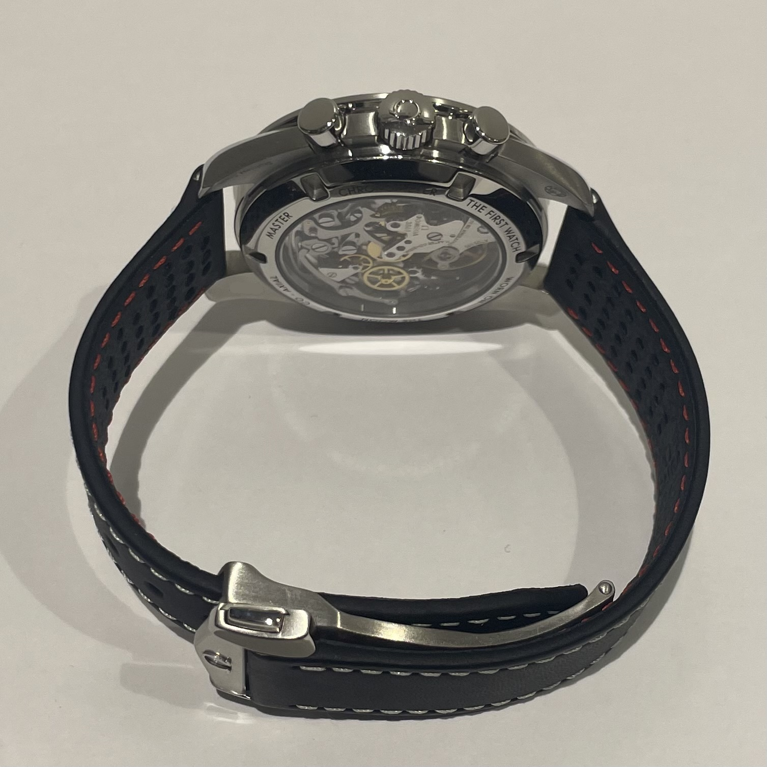 ラッカー文字盤が特徴的なお品物で、シースルーバックの為ムーブメントがご鑑賞いただけます。