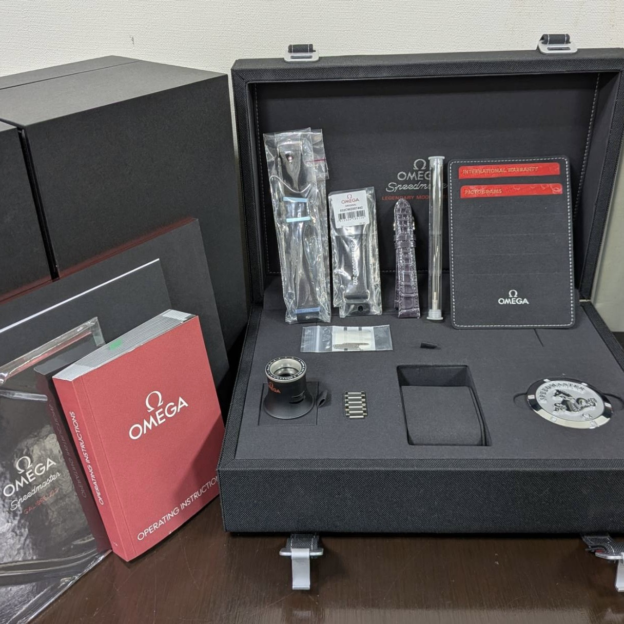 箱・保証書(2024年3月)・冊子・ピクトグラムカード・コマ×5・純正ベルト×3・ピン×4・ルーペ・メダル