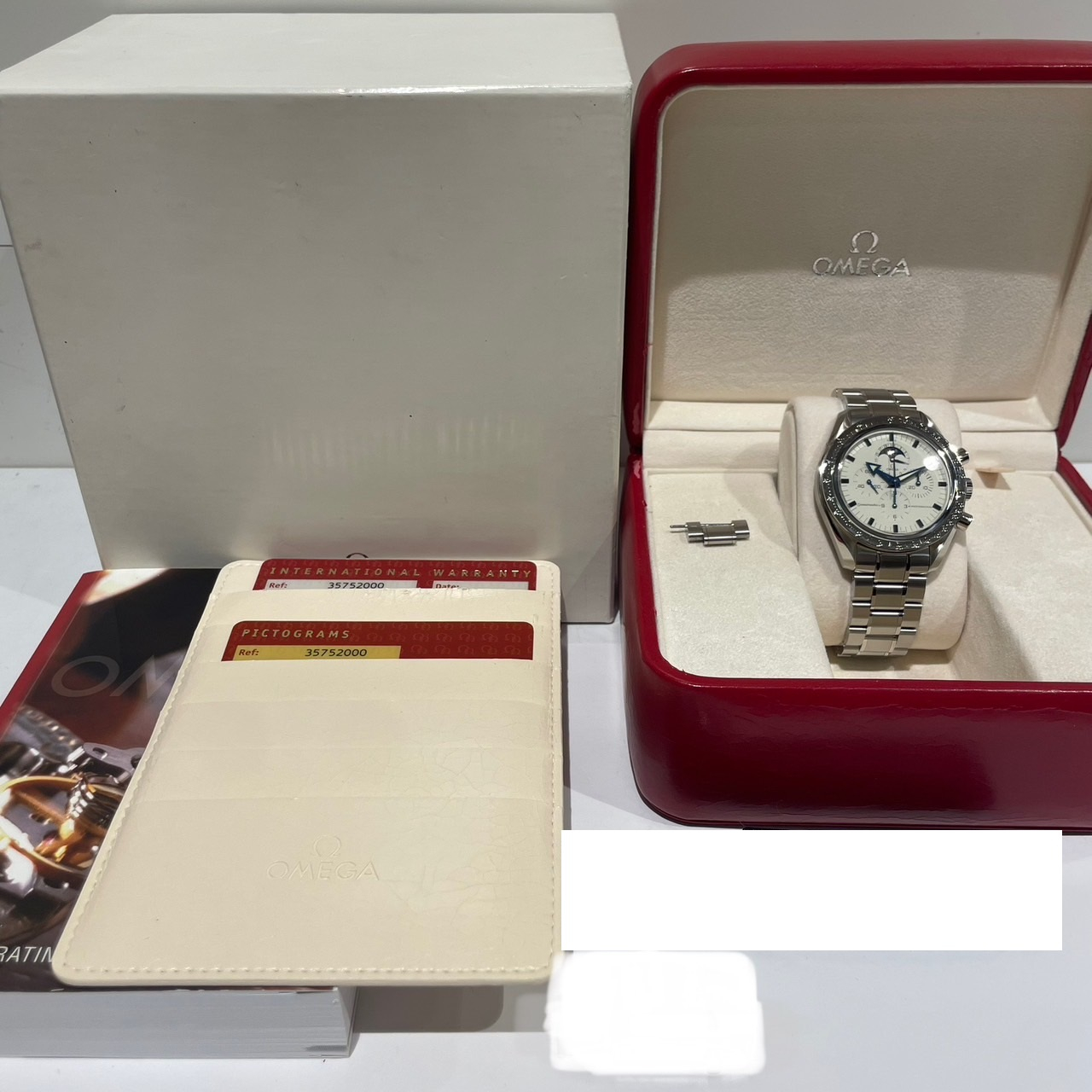 スピードマスターシリーズでも1stモデルにも採用されていたブロードアロー針とレマニア製手巻きムーブメントが採用されています。さわやかなホワイト文字盤にブルースチールがアクセントとなった人気モデルとなっております。是非ご検討くださいませ。