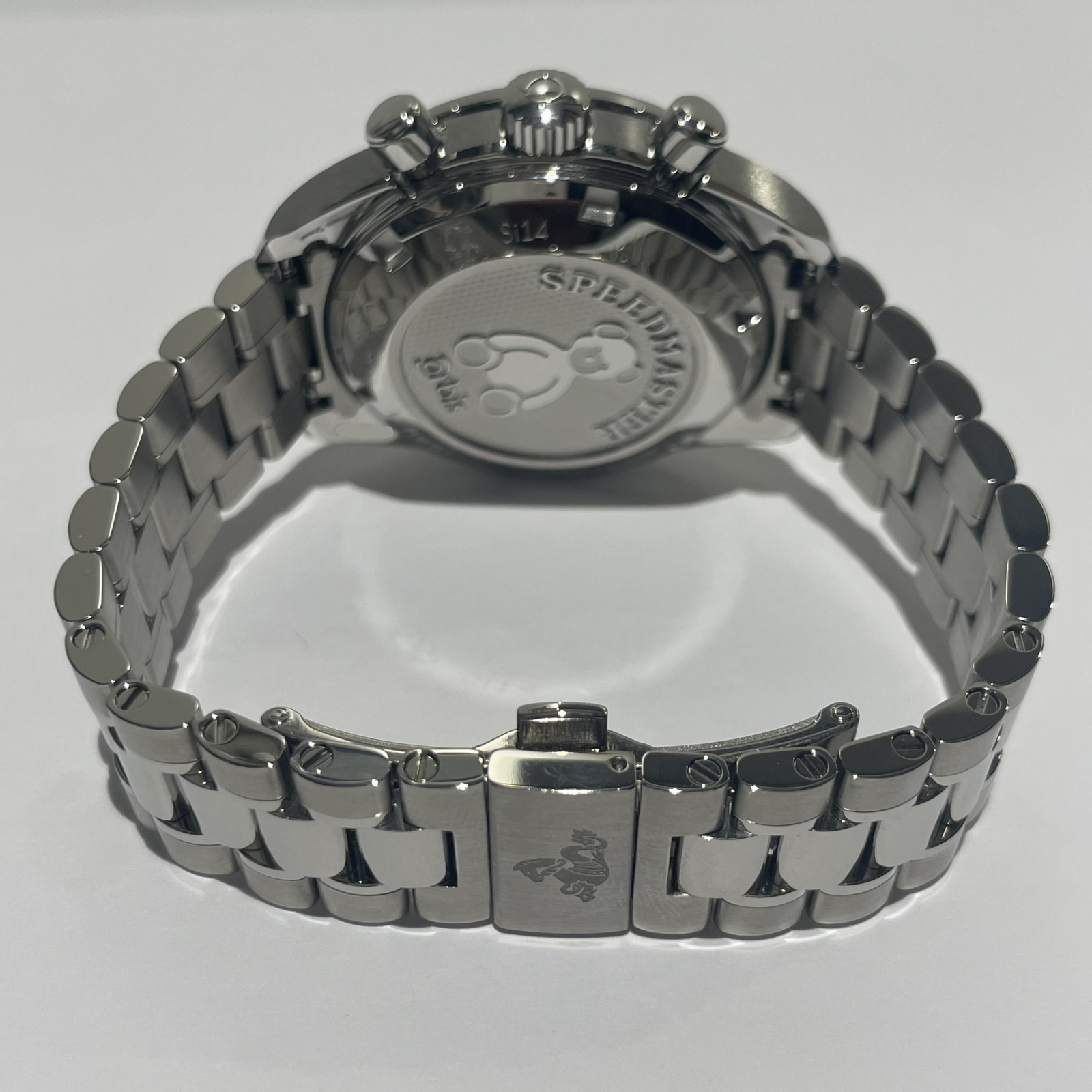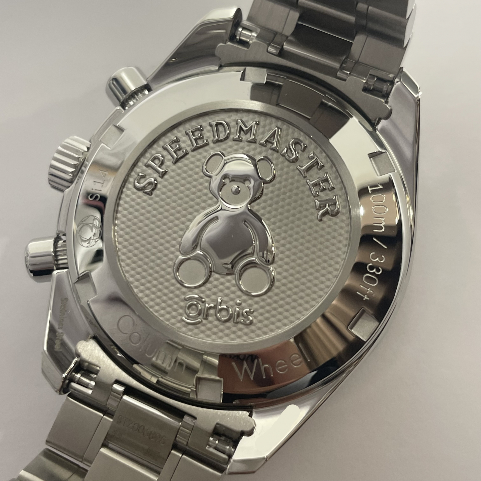 クロノグラフ秒針にはオービスの象徴でもあるテディベアを象った特別仕様の針が使用され、裏蓋にはテディベアのエングレービングが施されています。