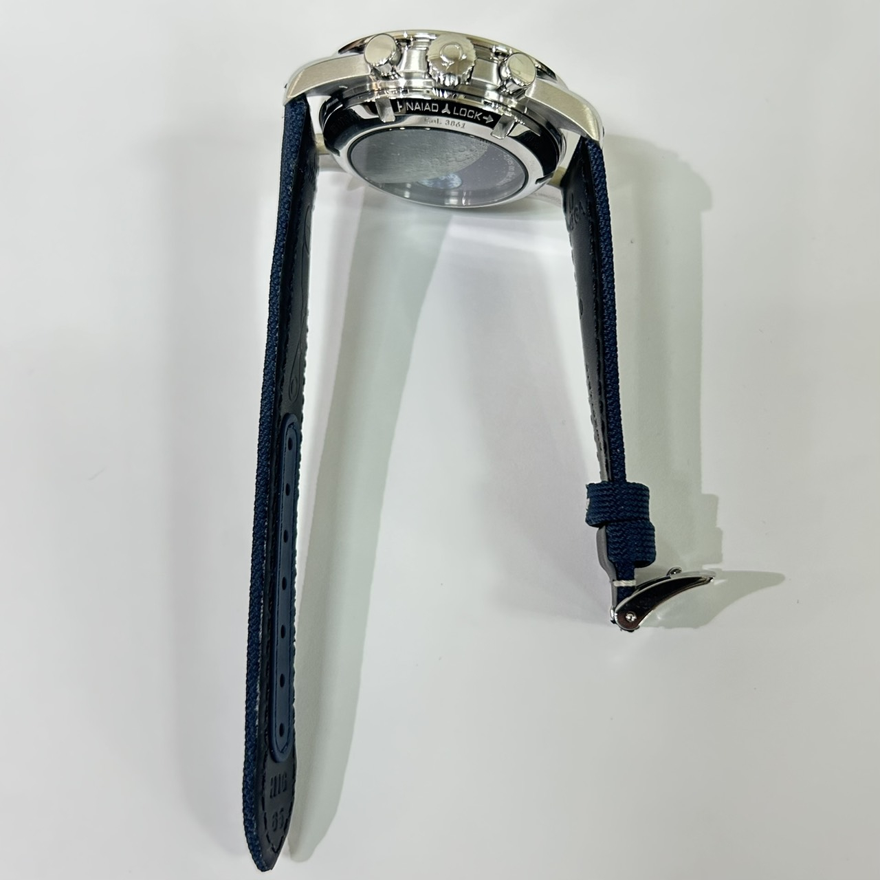 9時位置の可愛らしいスヌーピーとベゼルやインダイヤルの少し暗いブルーが宇宙を感じさせていて印象的です。クロノグラフを起動すると裏蓋に宇宙旅行中のスヌーピーが現れるというユニークなモデル。