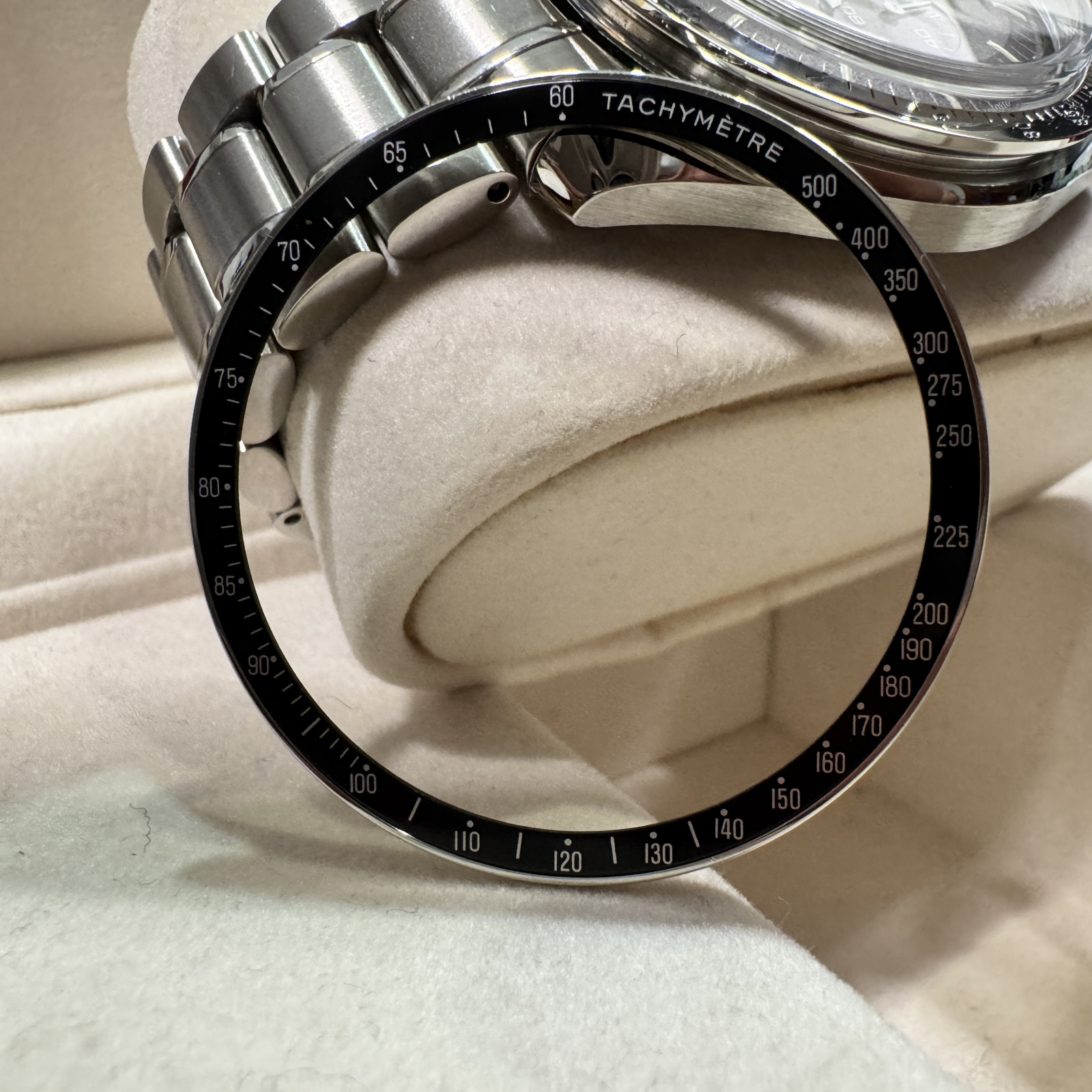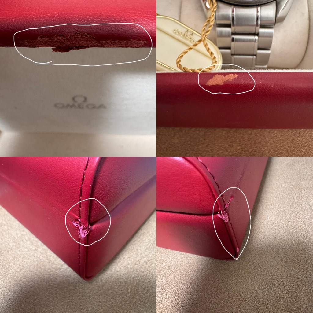 • 1.OMEGAの内箱(赤ケース)の傷み状態がわかる画像をお願いできませんでしょうか?   2.外したオリジナルのベゼルは、黒のタキメーター面、および外周部のベゼルリングは無傷でしょうか?