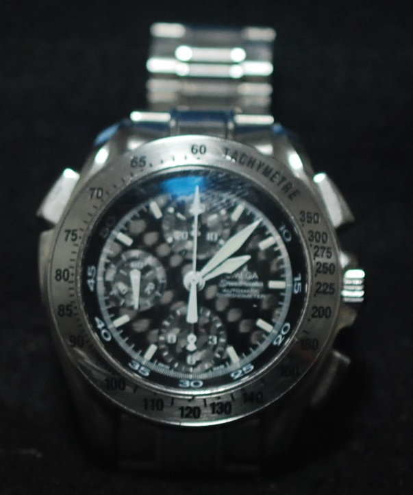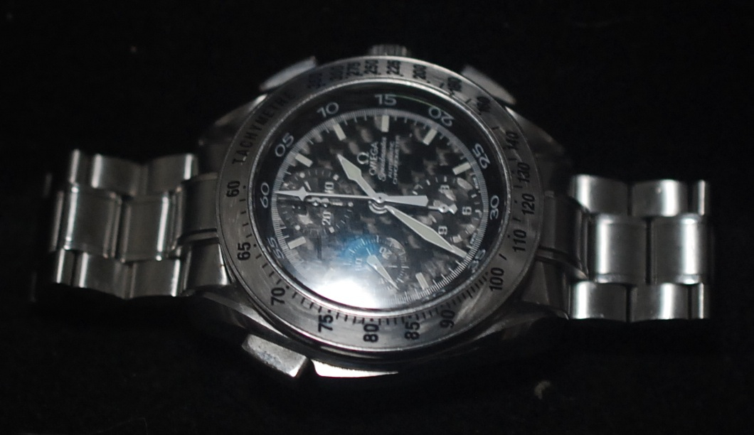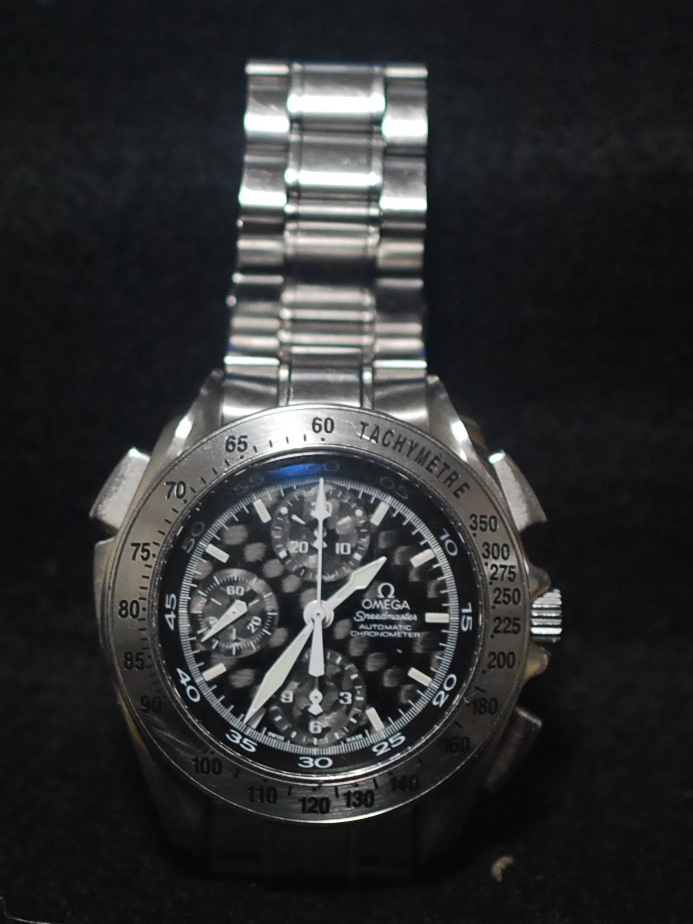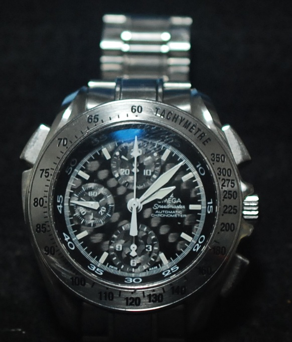 オメガ・スピードマスター・スプリットクロノグラフ黒カーボン模様文字盤・中古