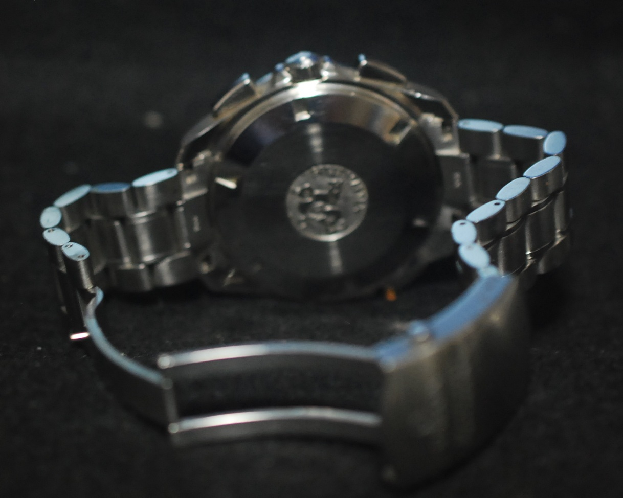 スプリットクロノグラフなので3ボタン仕様でストップウォッチ秒針が2本重なっています。