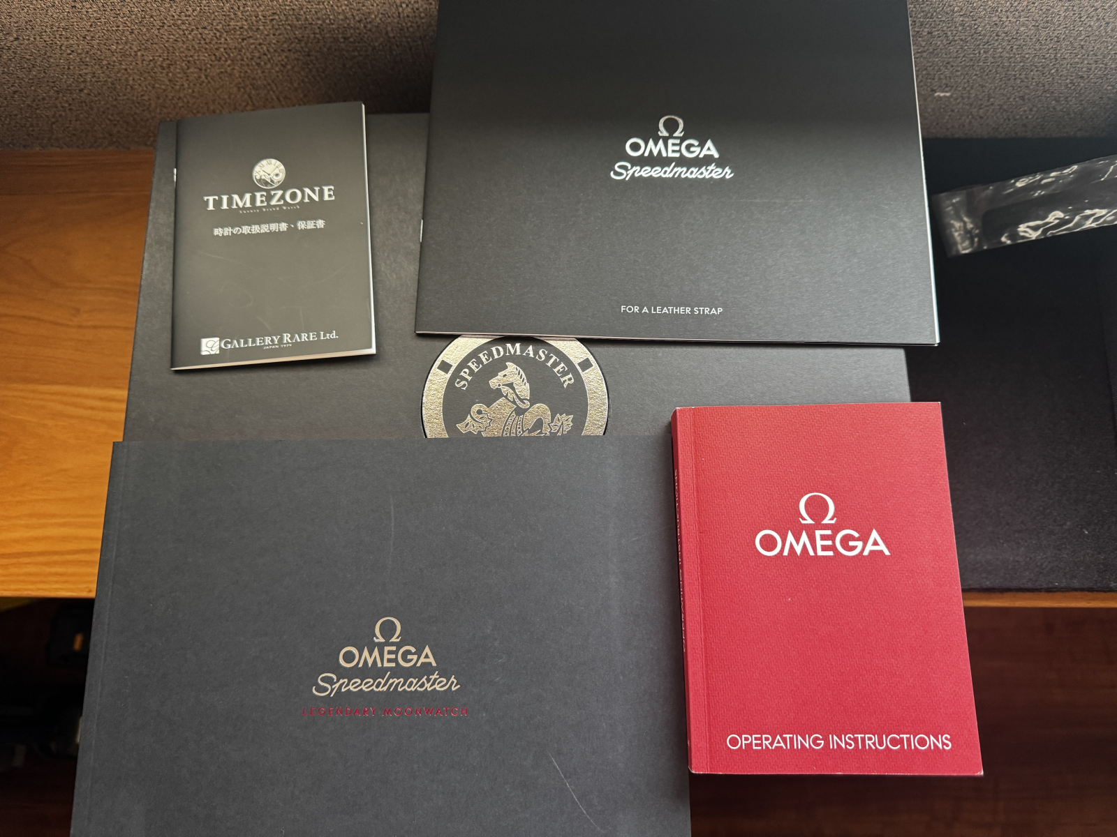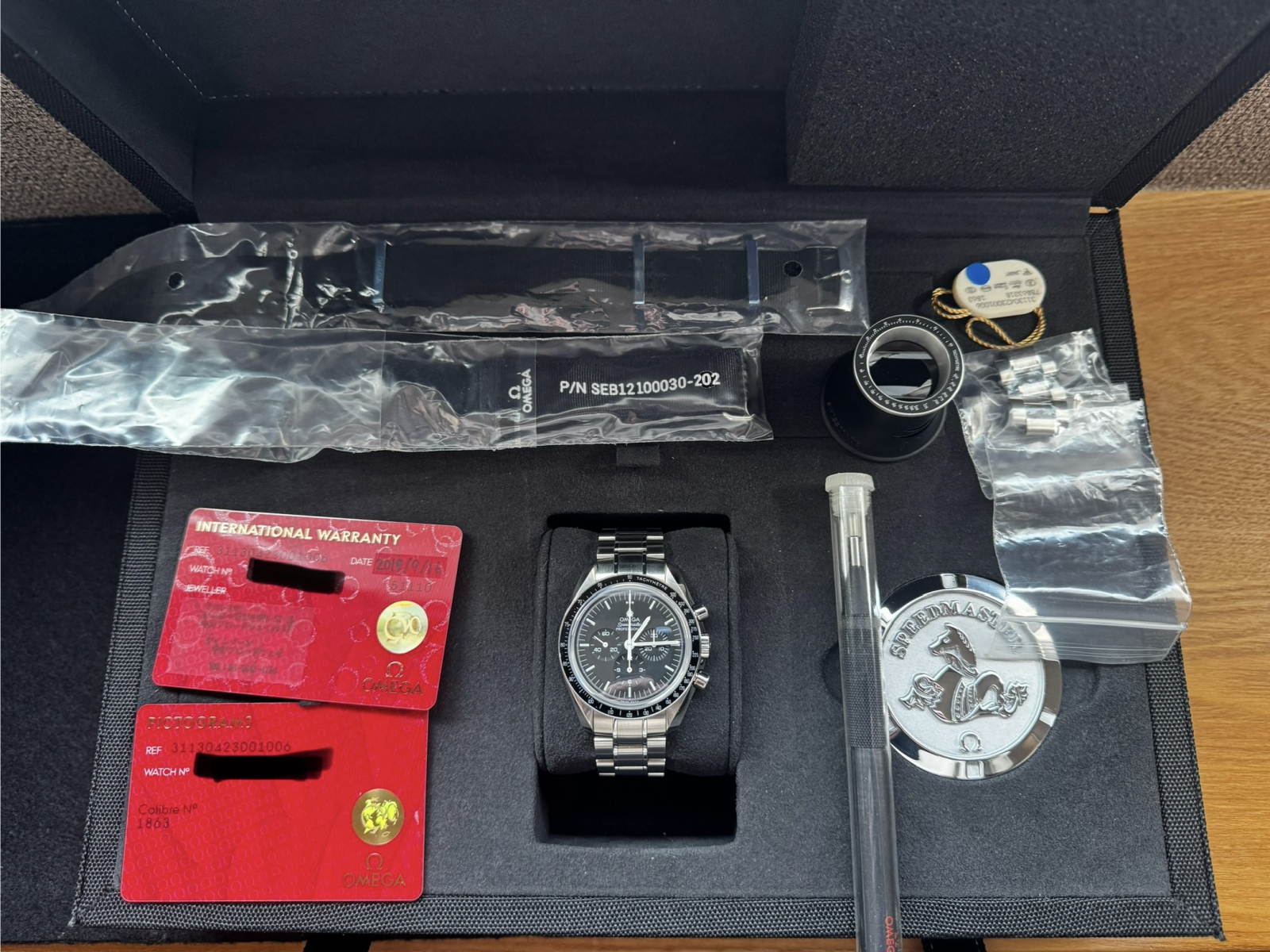 【付属】スペシャルボックス(内、外)、ギャランティーカード(2018年08月)、ピクトグラムカード、取扱説明冊子、ブレスレット用取説冊子、スピードマスター冊子、ナイロンベルト2本(専用のバネ棒2組)、専用ドライバー、ルーペ、OMEGA製品裏蓋に刻まれているエンブレムを模したメダル、タグ、外しコマ