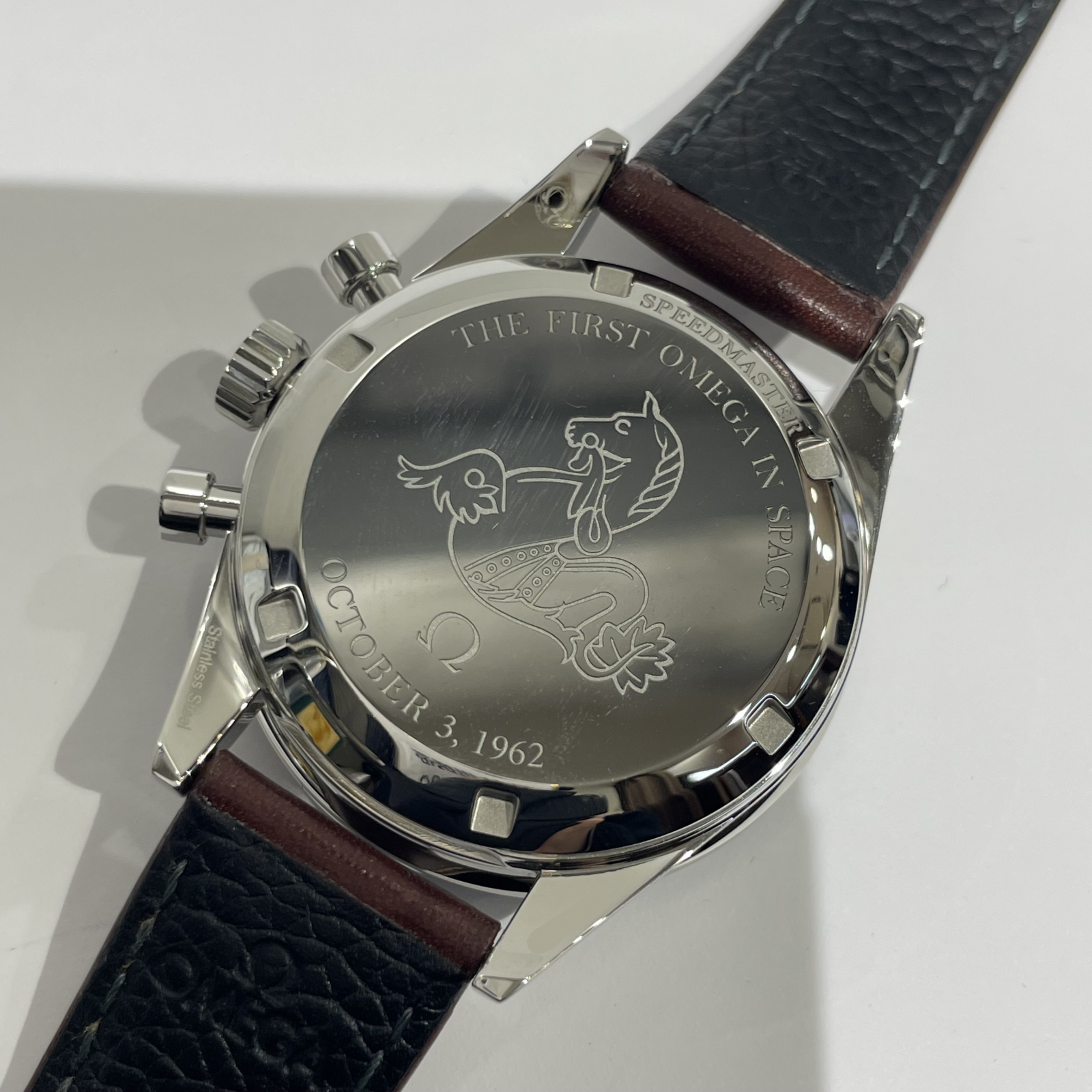 裏蓋には"THE FIRST OMEGA IN SPACE"と"OCTOBER 3,1962"という、これが最初に宇宙を旅したスピードマスターであることを証明する刻印がデザインされております。