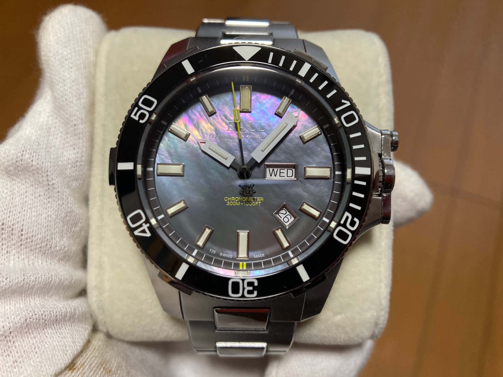 ダイバーズ時計では珍しいマザーオブパール(MOP)がとても綺麗な文字盤でお勧めです。