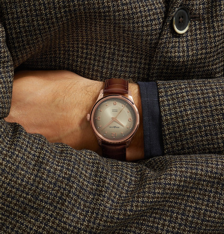 18Kローズゴールド製ケースに、スモーキーなグラデーションダイヤルを組み合わせ、ローズゴールドカラーのアラビア数字とドットインデックスを配置。