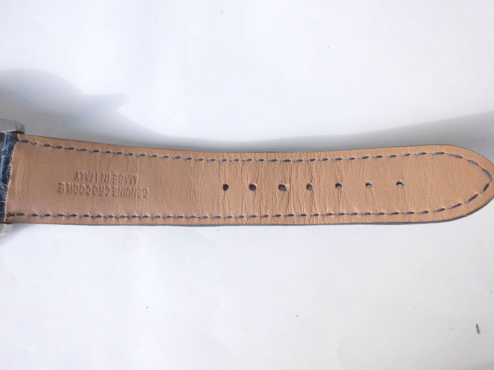 このモデルは、ブルーの文字盤にブルーのクロコダイルストラップを組み合わせた美しい時計です。