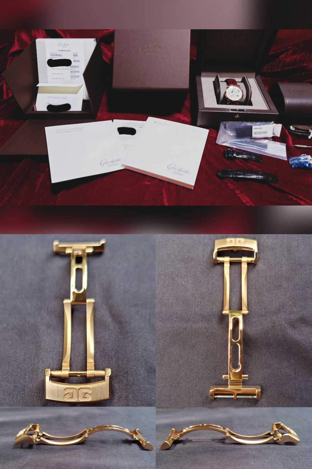 純正レザーストラップ、純正Dバックル、純正ラバーストラップ(未使用)、サービスワランティー、保証カード、冊子類、箱、ムーンフェイズ調整兼Dバックル用ドライバーピン、カシス ADONARA C(バーガンディー)、カシス Dバックル