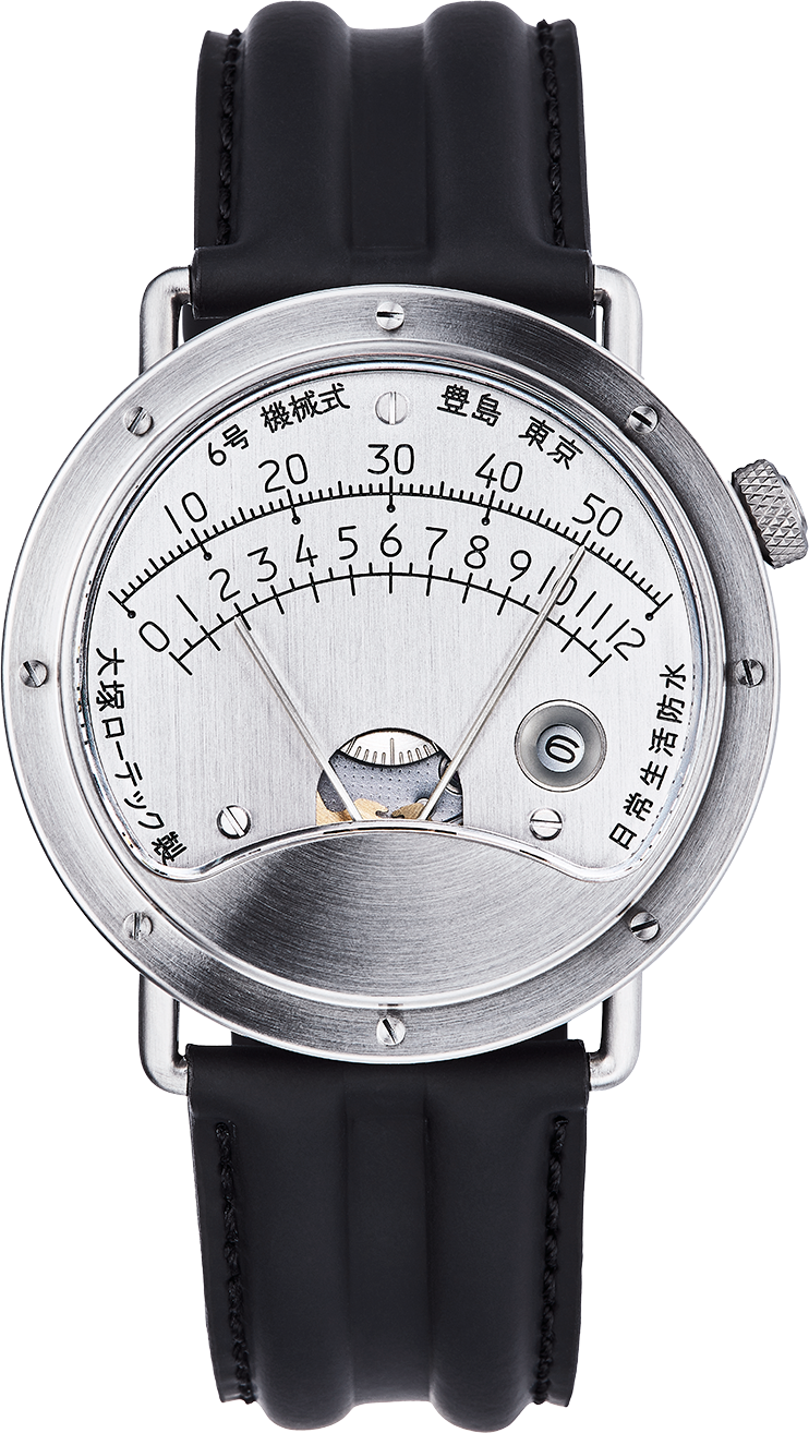 扇型に表示されるアナログメーター。レトログラード機構の時分針を同軸に配置。MIYOTA製ムーブメントに自社製モジュールを搭載し、瞬時に帰零する時分針、中央には秒ディスク、中央右に日付表示を有する。