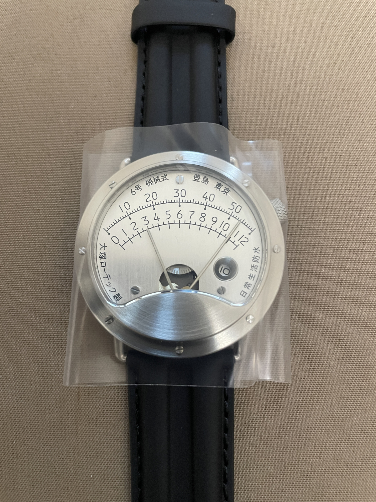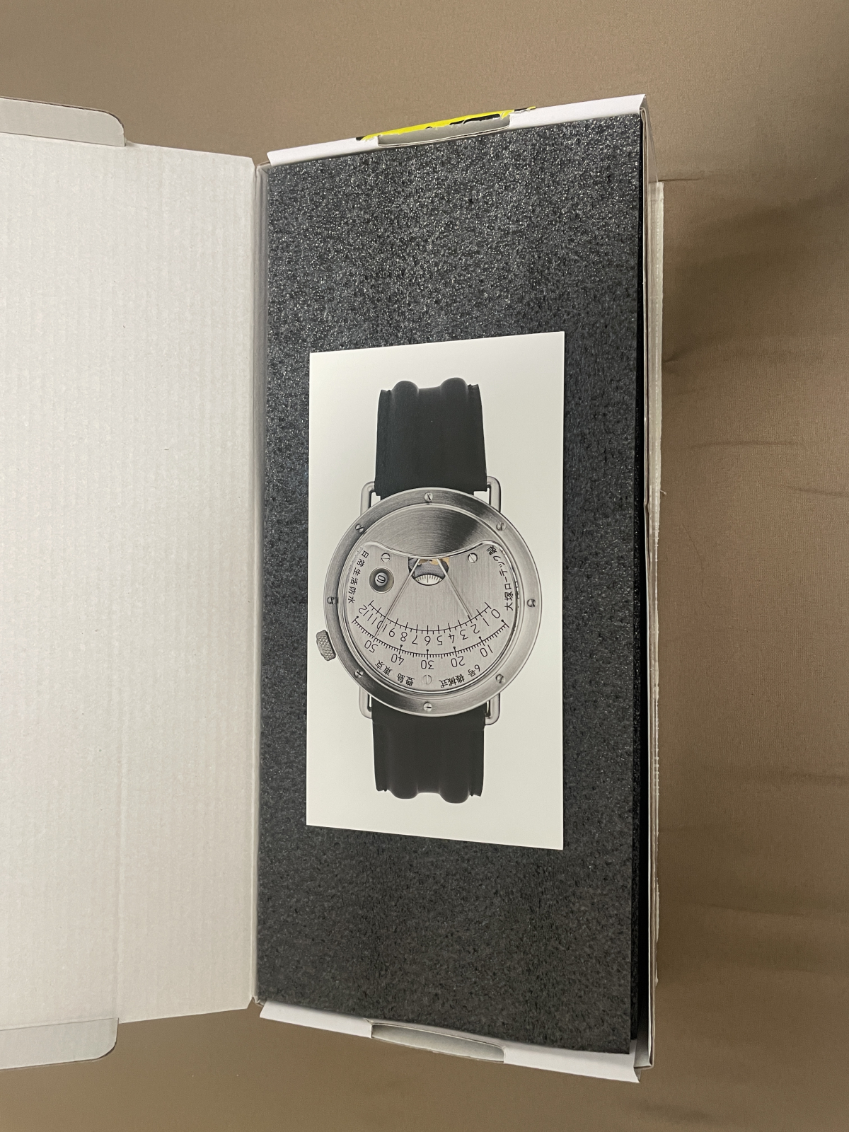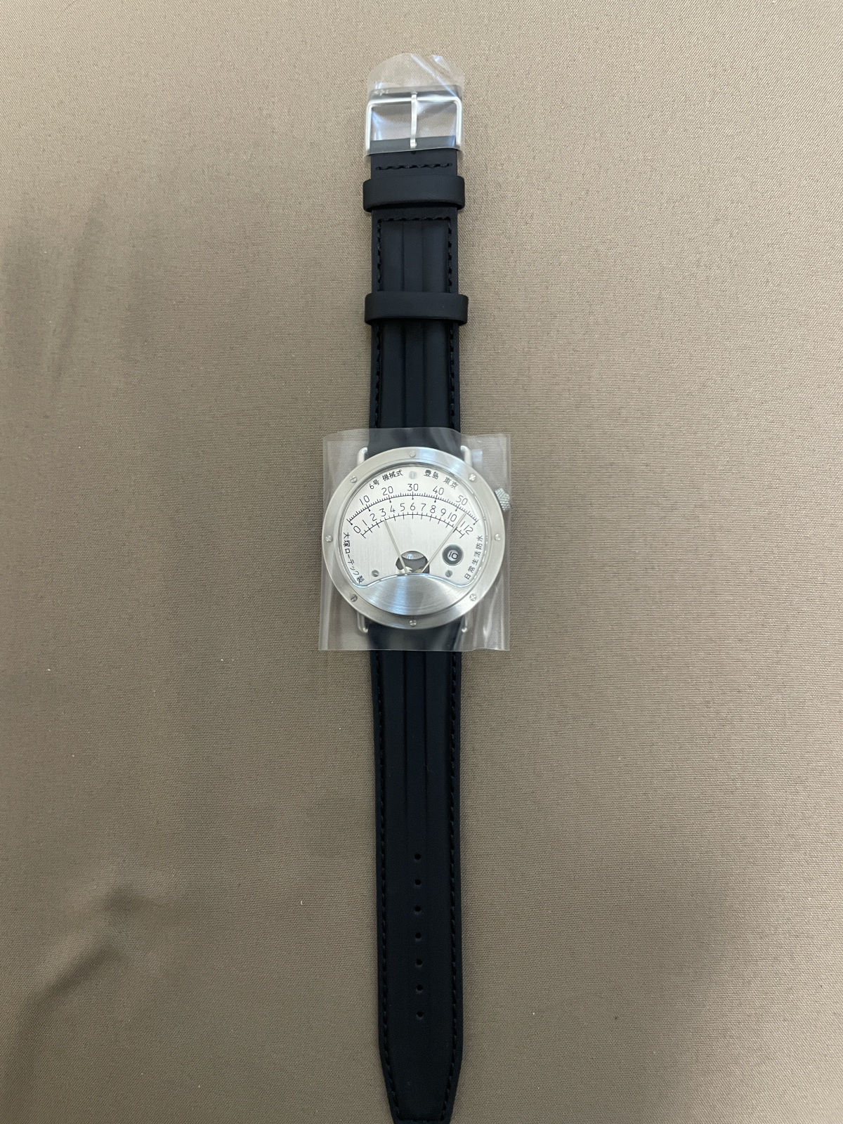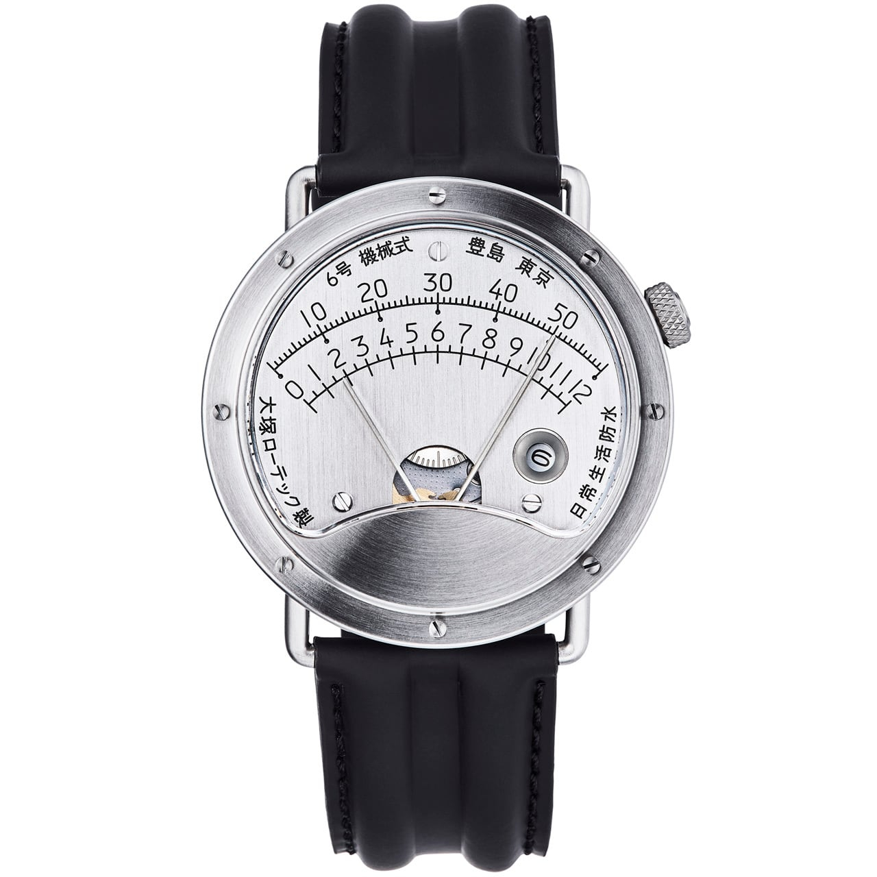 扇型に表示されるアナログメーター。レトログラード機構の時分針を同軸に配置。MIYOTA製ムーブメントに自社製モジュールを搭載し、瞬時に帰零する時分針、中央には秒ディスク、中央右に日付表示を有する。