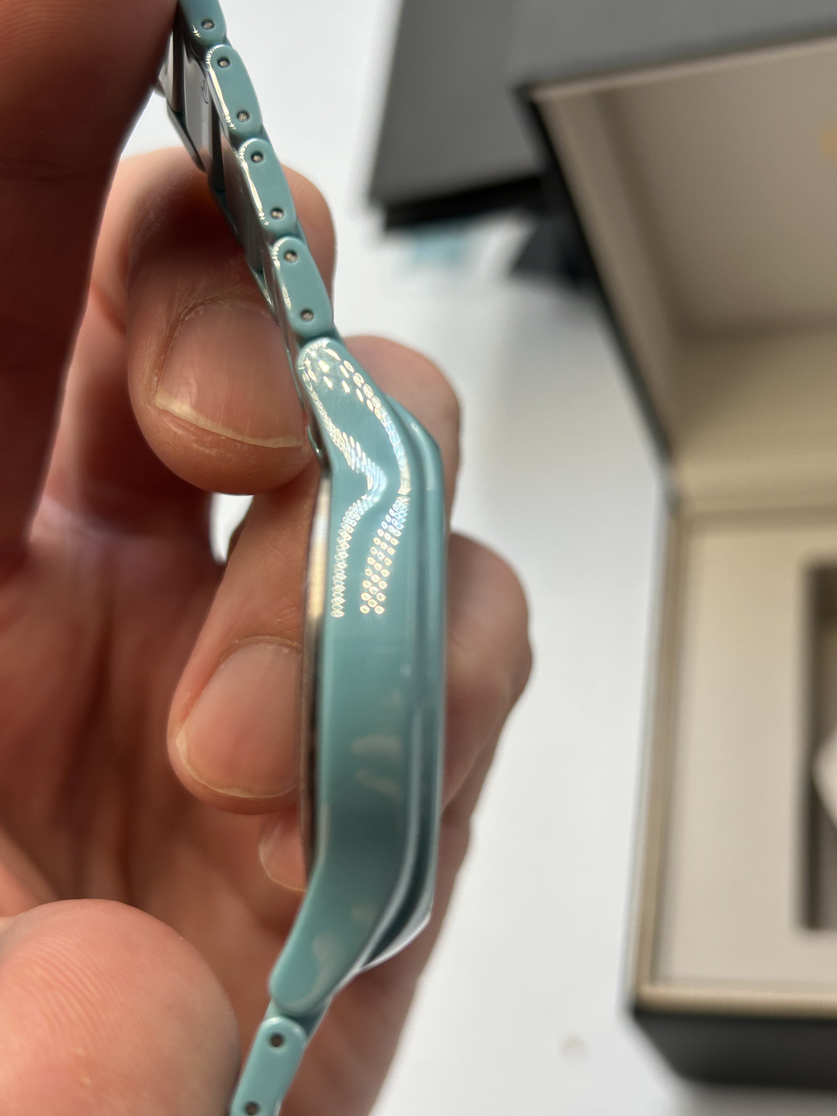 ポリッシュ仕上げターコイズ ハイテクセラミック、チタン製3つ折れ式バックル
