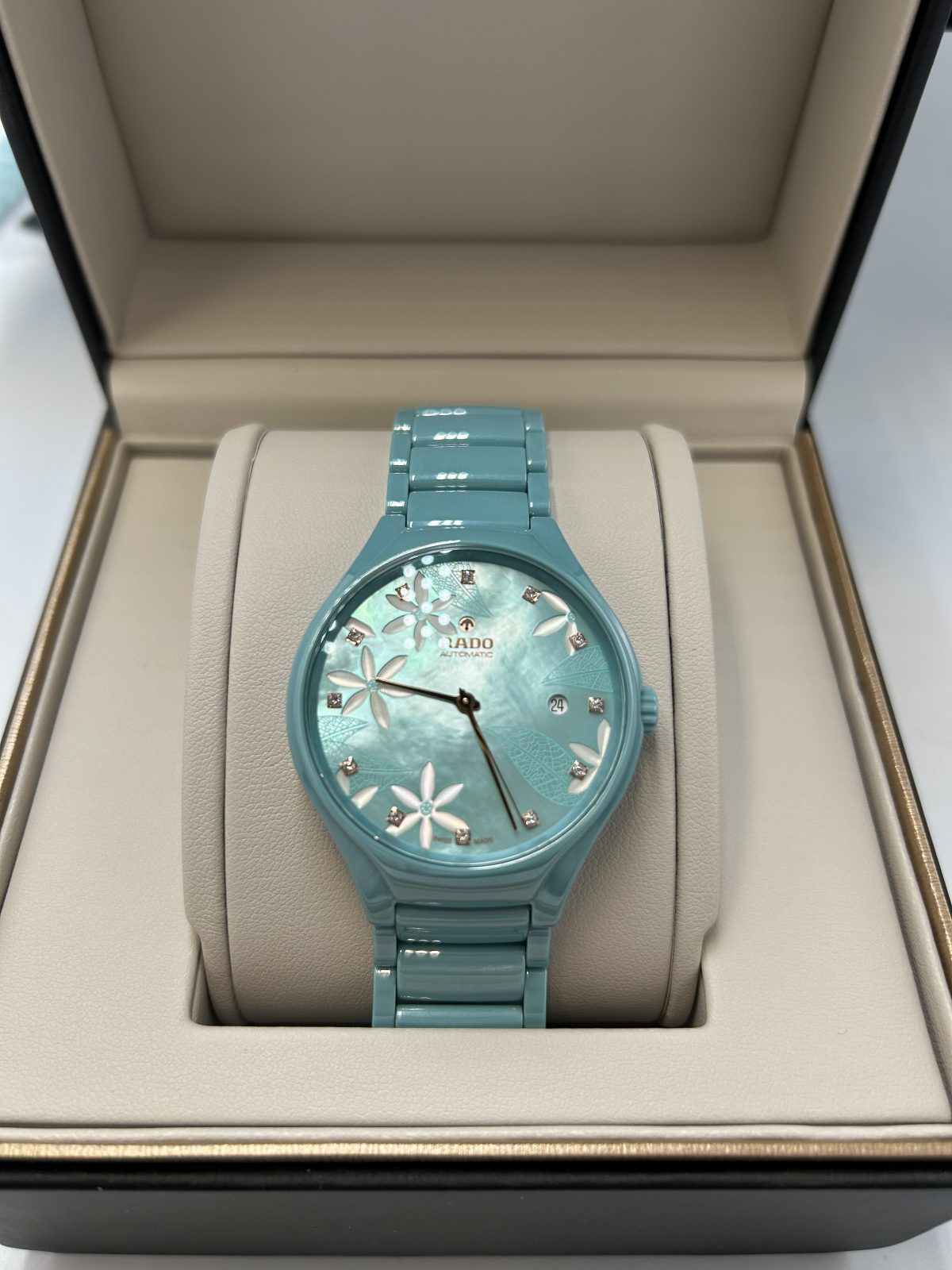 ターコイズ マザー・オブ・パール、エングレービング加工シルバーカラーの花と緑の葉、ジュビレ、12 ポイントダイアモンド、135/140、トップウェッセルトン、VS-SI、フルカット、0.12カラットローズゴールドカラー 動く錨のシンボル、RadoおよびAutomaticのローズゴールド カラー プリント ロゴ