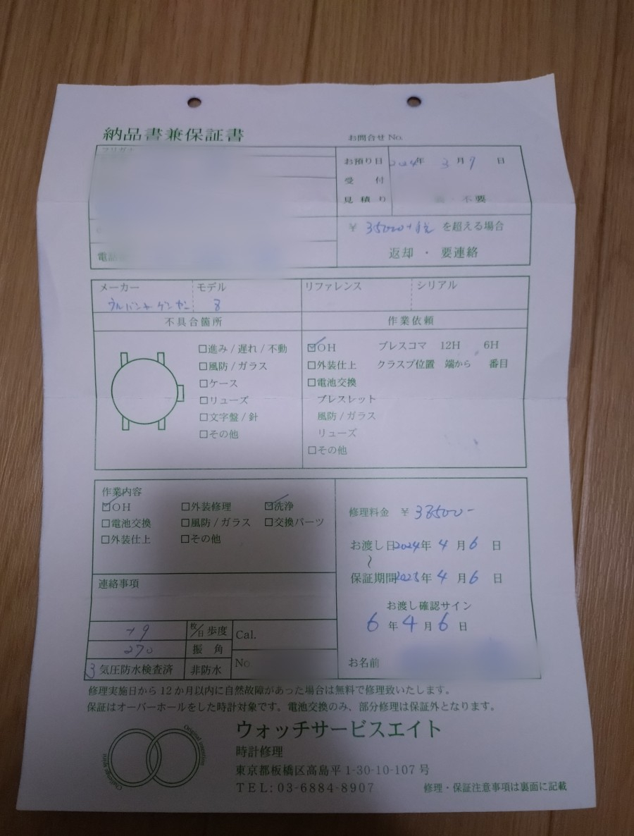 街の時計屋でOHをしていますので、すぐにご使用になれます。なおご希望があれば修理明細書(個人情報欄切り抜き)をおつけしますが、