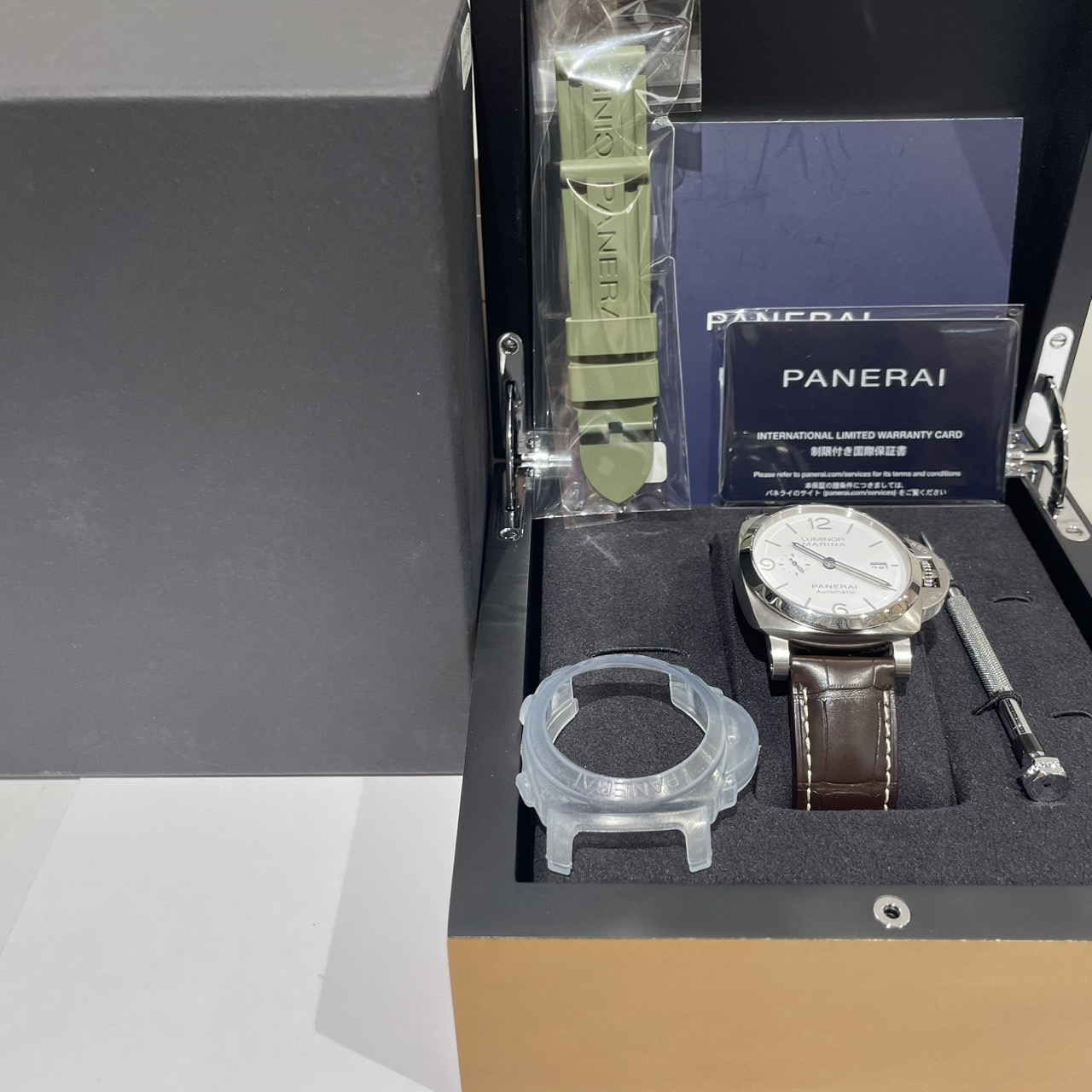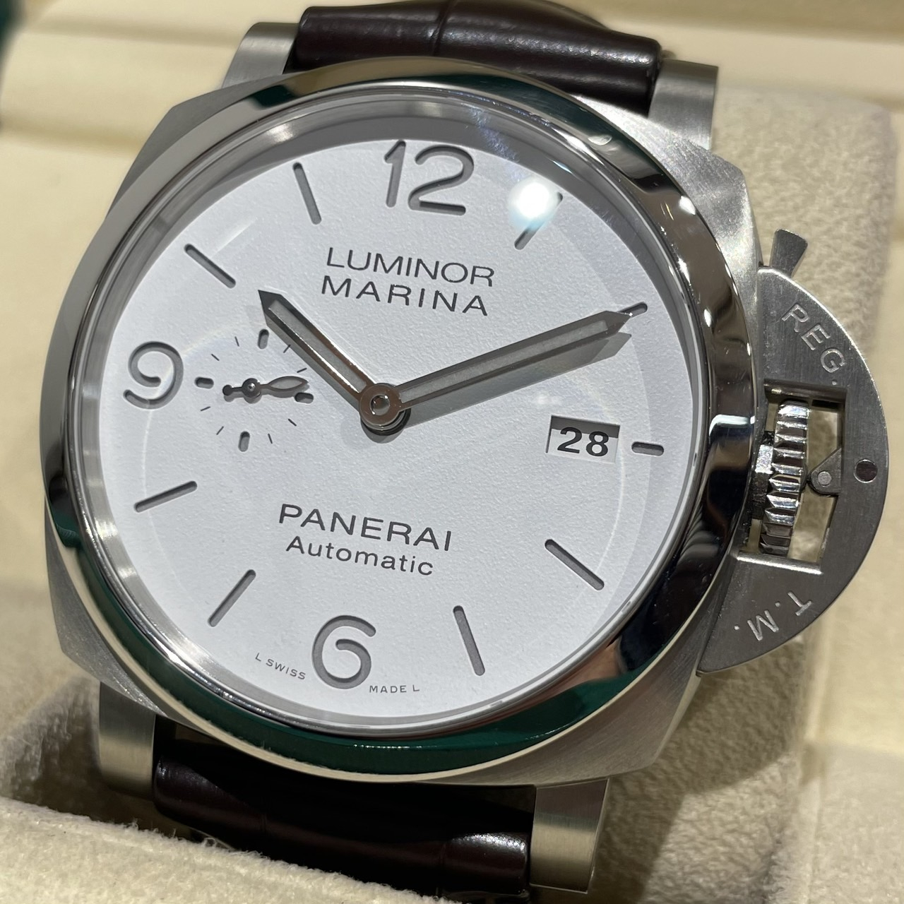 パネライらしい直径44mmのケースは存在感抜群で、白文字盤が非常にかっこいいモデルとなっております。また、交換用のラバーストラップも付いているので使用するシーンや季節によって交換できるのも点も売りです。