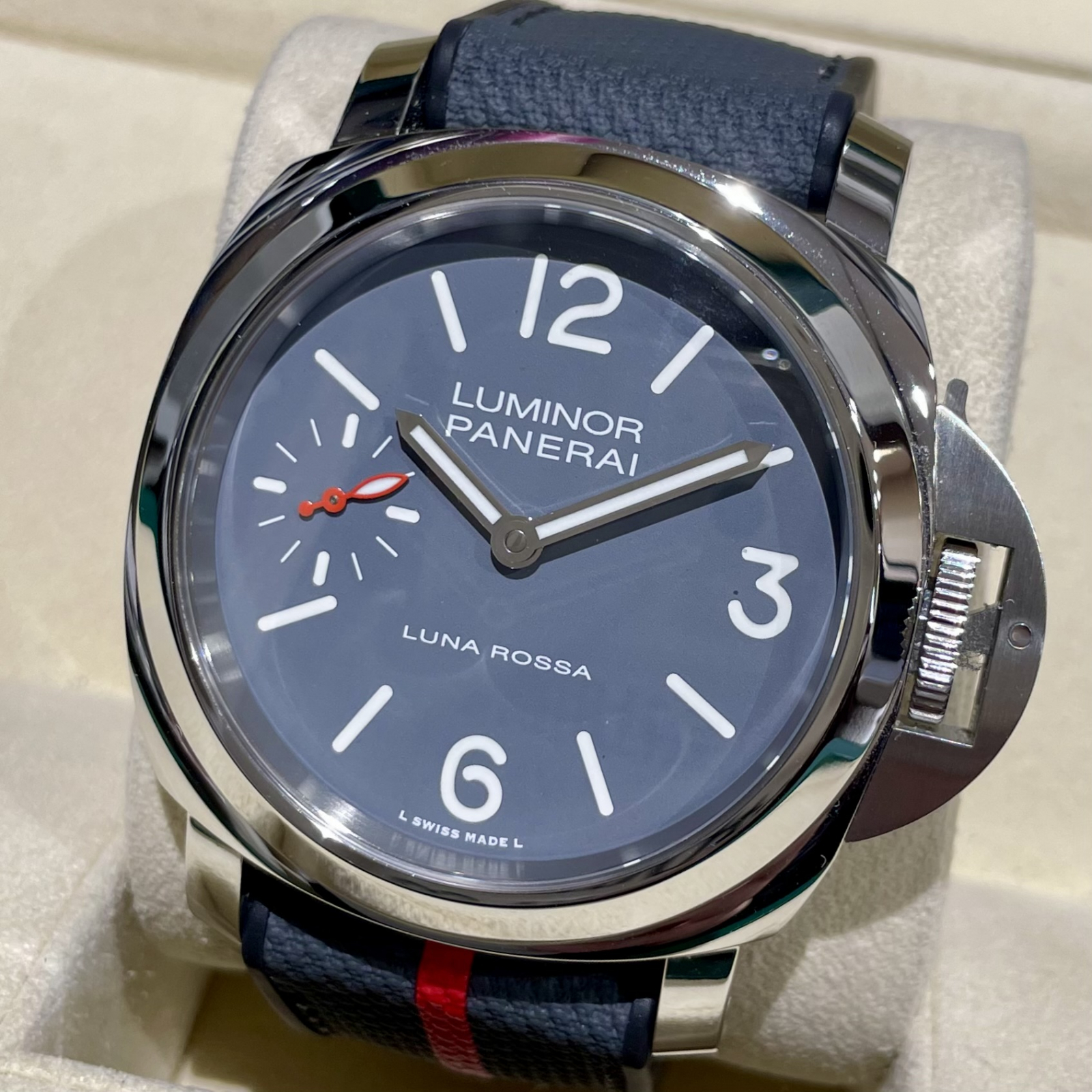 2025年の新作の珍しいグレー文字盤で、モデル名にはイタリアを代表するヨットチーム「ルナ・ロッサ」が入った特別感のある一本です。