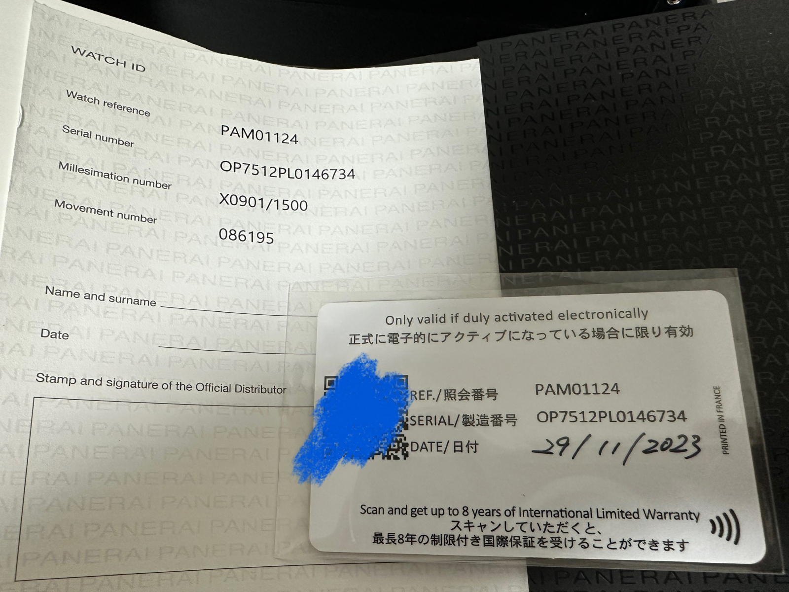 【付属】ボックス(内・外)、ギャランティー(国内正規、2023年11月)、冊子、ケースカバーWATCH ID(販売店記載なし)