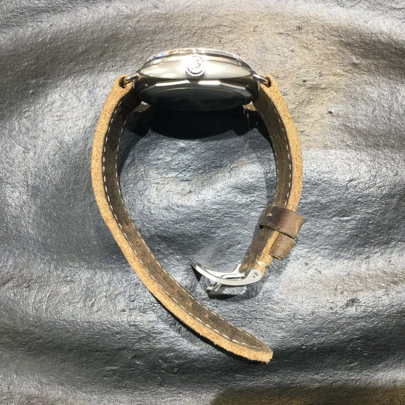 経年変化したようなグラデーションの文字盤と、エイジド加工の施されたスチールが特徴的な1本です。