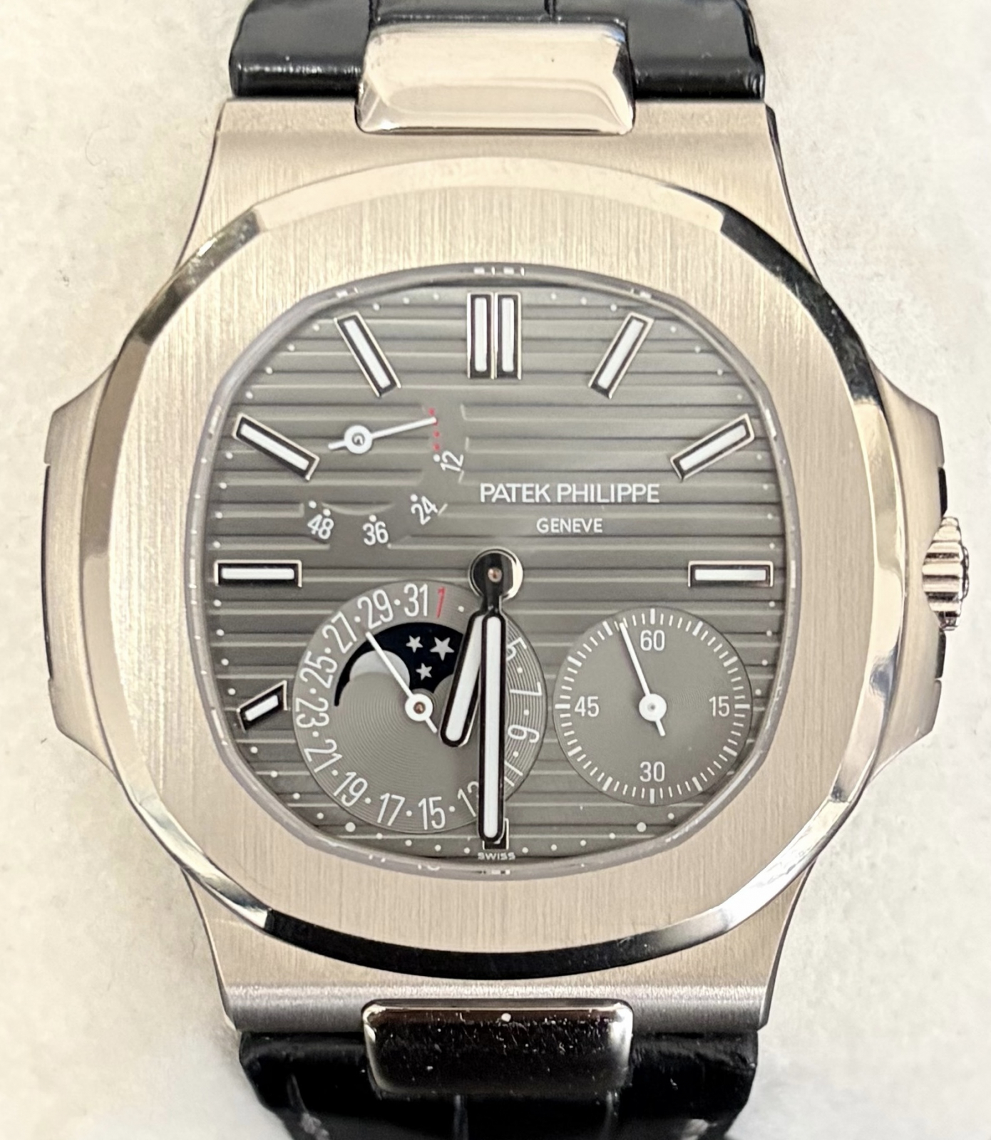 このモデルの最大の魅力は、機能美を追求した独特の文字盤デザインにあります。パワーリザーブ表示、ムーンフェイズ、日付表示が絶妙に配置されたアシンメトリーな構成は、パテックフィリップならではの精密さと美学を感じさせます。スレートグレーの文字盤とホワイトゴールドケースのコントラストも美しく、ビジネスシーンからフォーマルな場面まで幅広く活躍します。