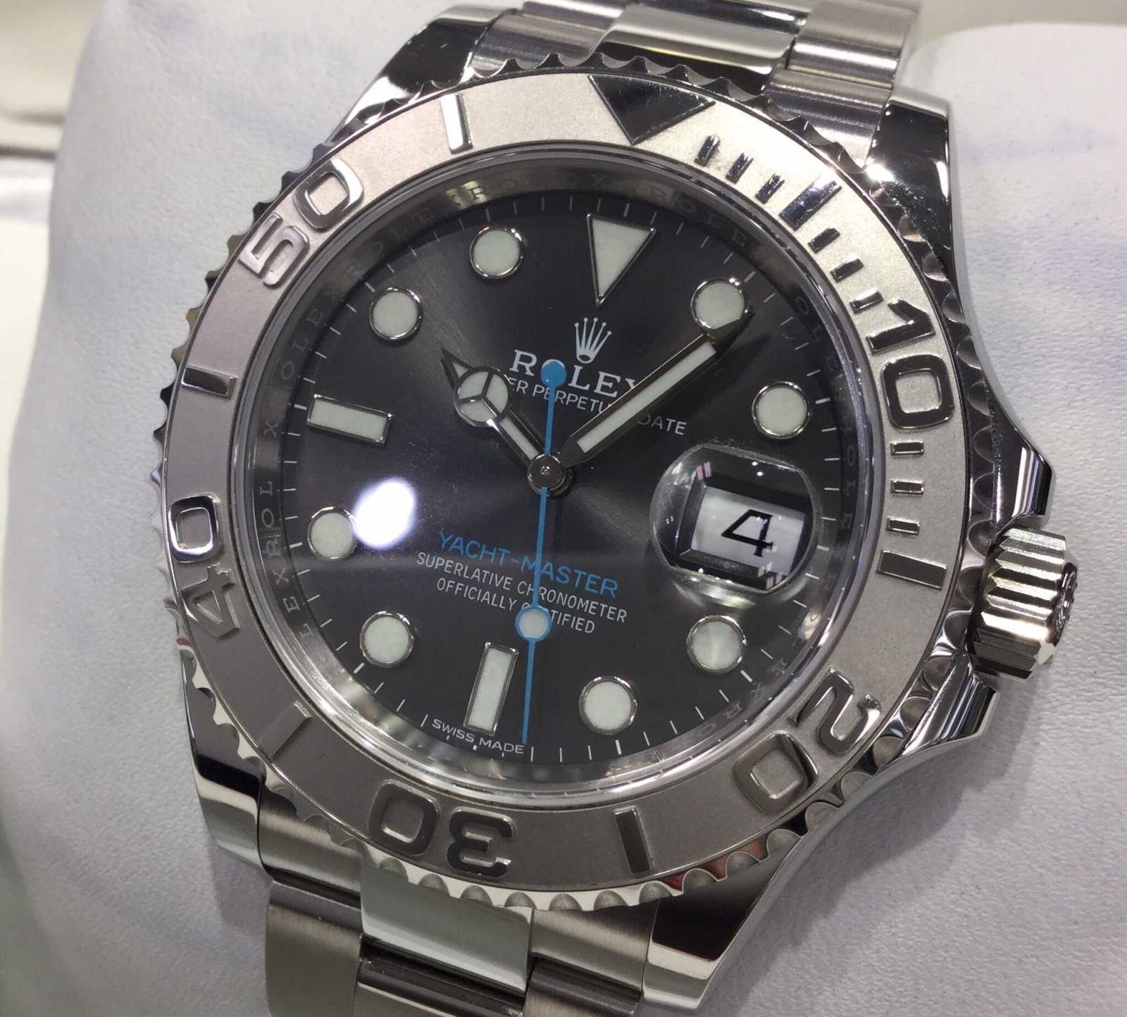 ・バーゼル2016発表のヨットマスター Ref.116622 ダークロジウムが入荷致しました。ダイアル上のモデル表記や秒針はライトブルー(水色)を採用しており、今までのロレックスにはあまりみられなかったテイストとなっており、高い人気を誇ります。サンレイ仕上げの上品なグレーダイアルにライトブルーの差し色も相性抜群です。