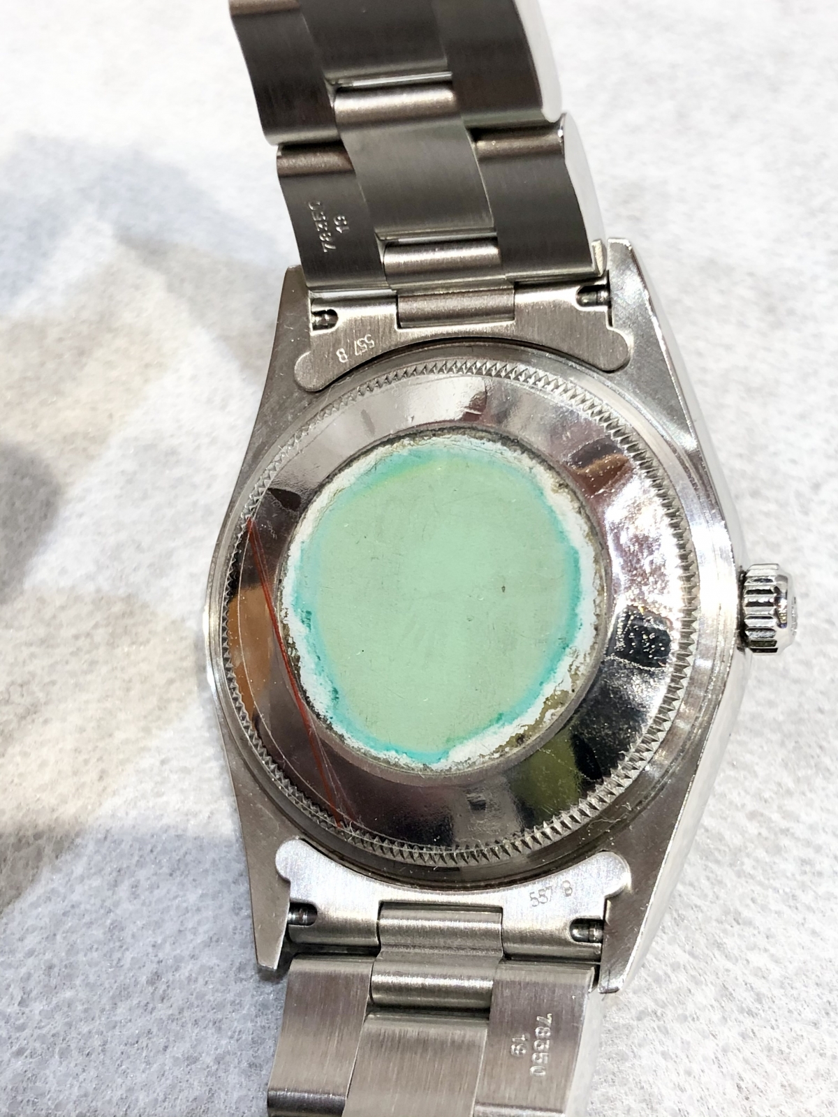 文字盤に細かいシミがあります。またベゼルに小キズがございます。