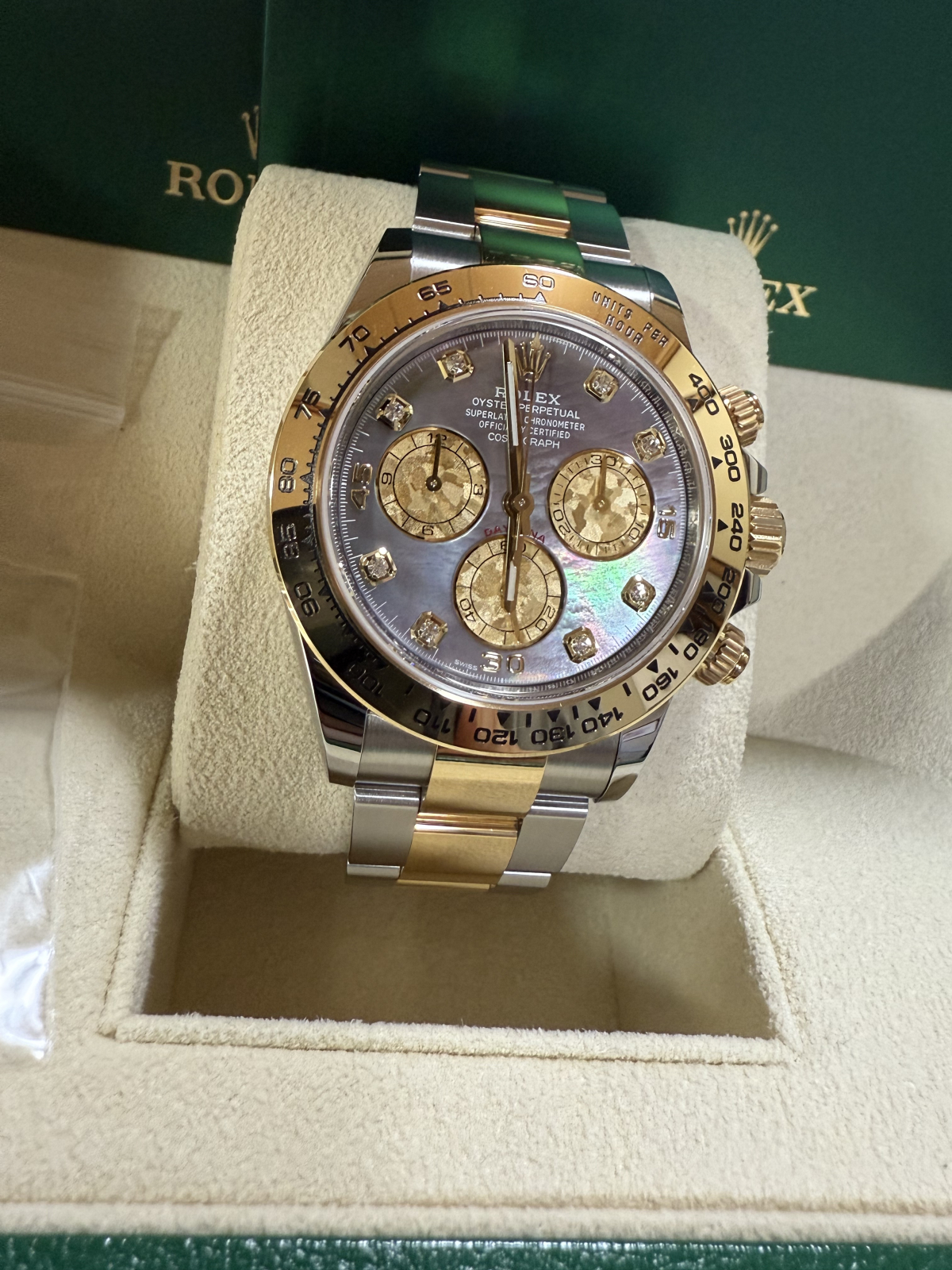 デイトナのシェル文字盤は加工が難しく、文字盤も大きい為限られた技術者のみが取扱う事しかできない為個体数も少ない事から今後希少性になる可能性が極めて高いモデルでございます。 自身で新品購入後に室内数回着用の綺麗な個体です。(微細な擦れのみ)シェルの色味にも拘って選んだ個体になります。