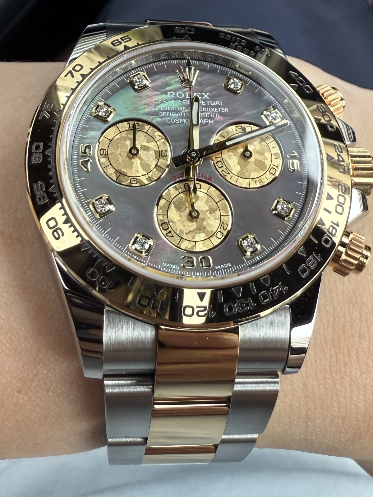 ブラックシェルはデイトナの中でも特に存在感があるモデルで、ホワイトシェルはオイスターフレックス展開がありましたが、ブラックシェルはフル金無垢、コンビモデルのみで希少性も段違いかと存じます。こちらのモデルは状態が大変いいので、資産として保管する、使って楽しむの両方を所有者が選べる点でもおすすめです。
